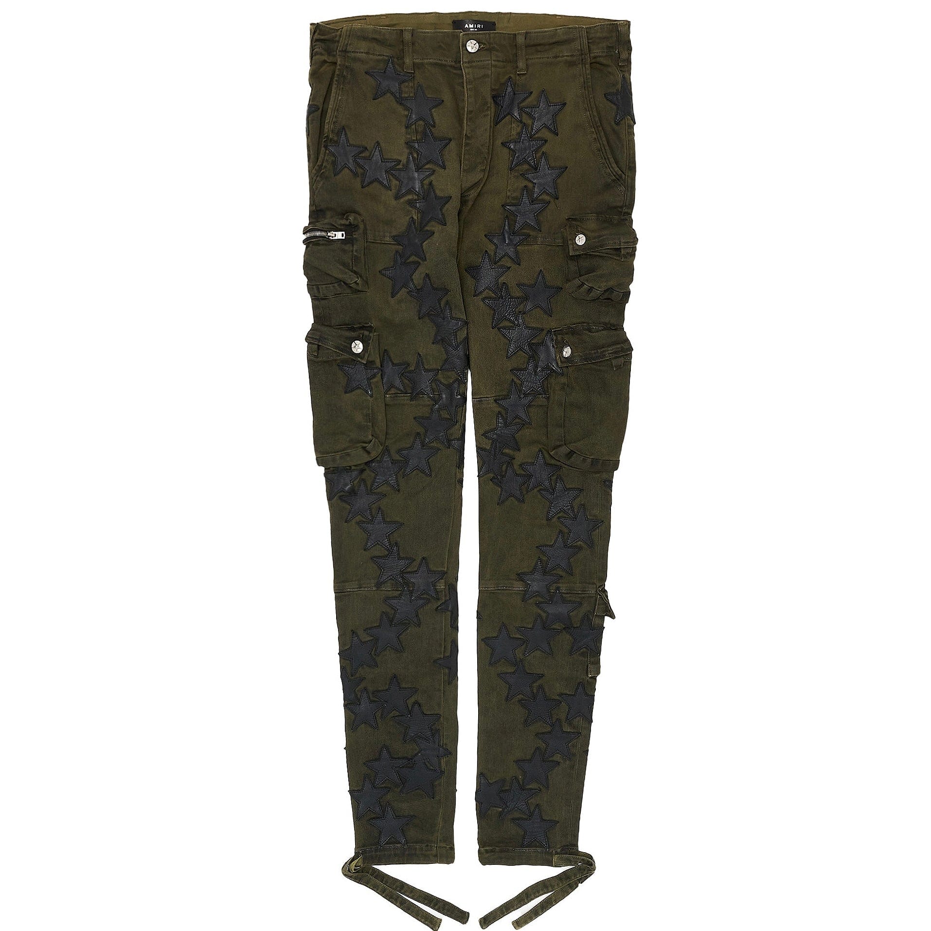 Amiri x Chemist Black Leather Star Patch Tactical Cargo Jeans Olive Green