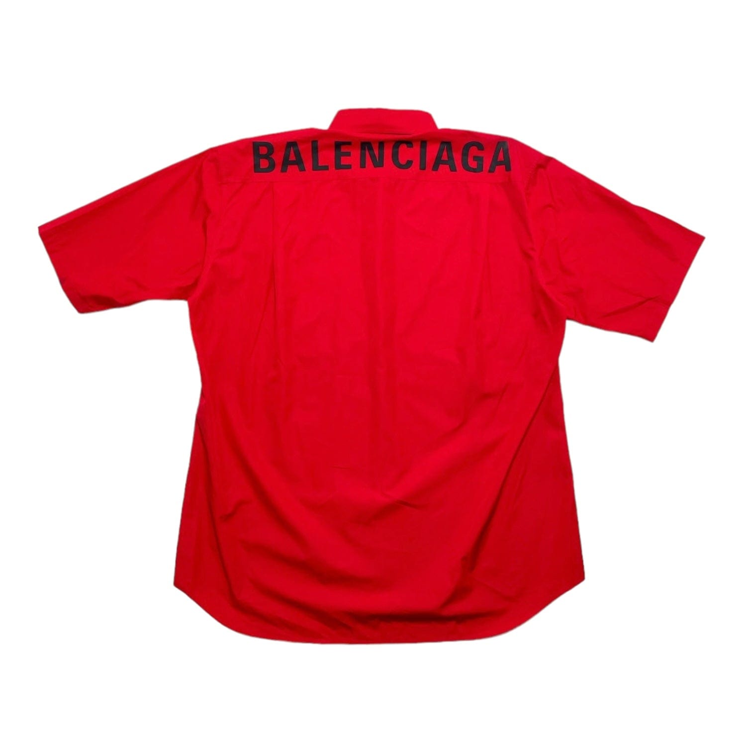 Origins NYC offers this new Balenciaga Back Logo Button Up Shirt in Red.