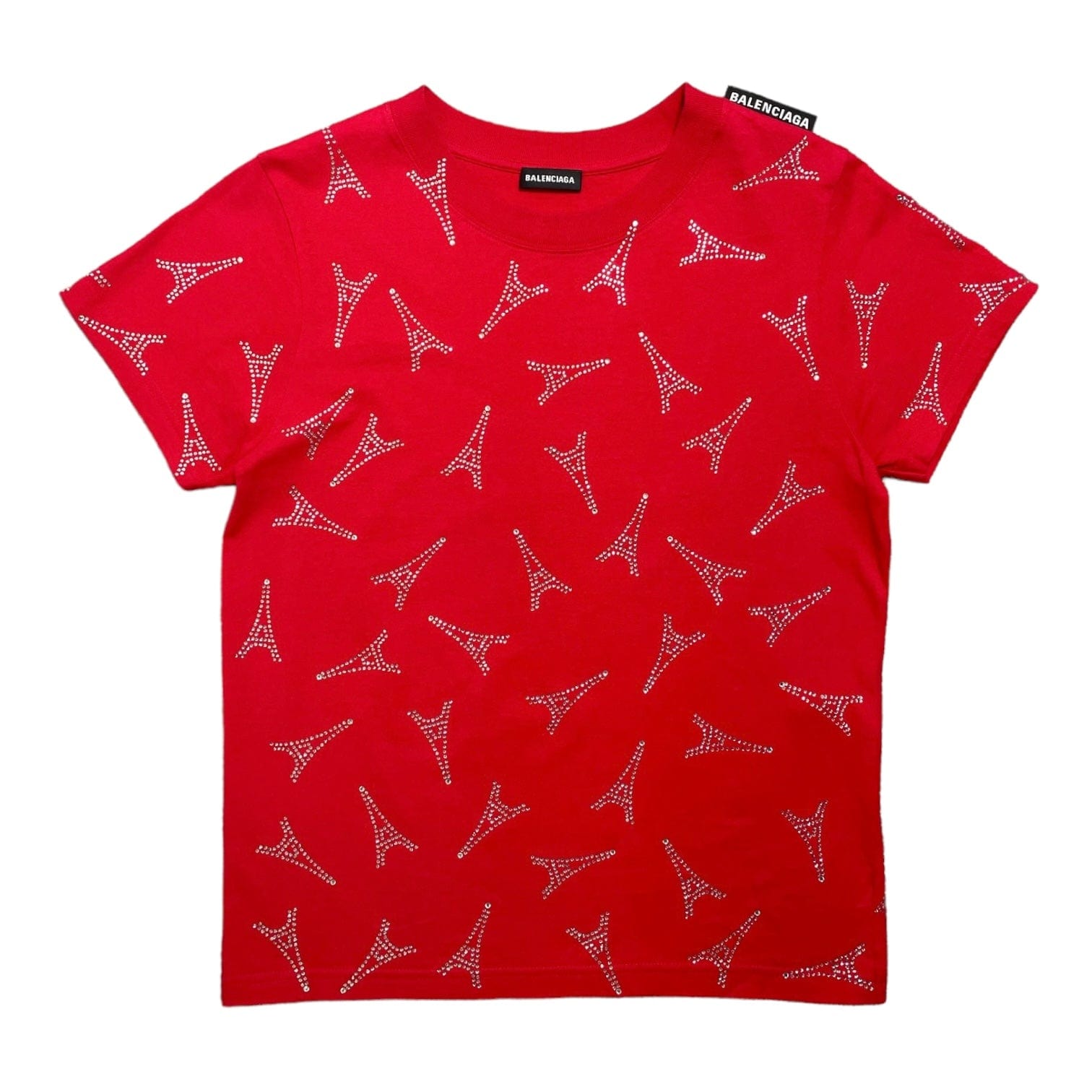 Balenciaga Crystal Stud Eiffel Tower Short Sleeve Tee Shirt Red (W)