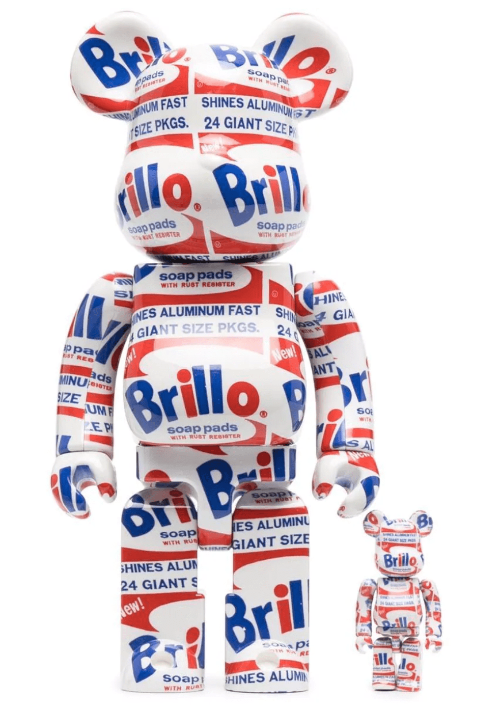 Inspired by a 1964 work entitled Brillo Soap Pad Boxes by legendary pop artist Andy Warhol, the Bearbrick Andy Warhol "Brillo" 100% & 400% Set includes two identical ursine shaped figures that stand 2.75 inches and 11 inches respectively. Both figures in the set feature the Brillo Pad logo and box branding printed across the entirety of their bodies. The original Brillo Soap Pad Boxes piece was created to force audiences to consider mass production and art as a consumer product. Take home a piece of art history with the Bearbrick Andy Warhol "Brillo" 100% & 400% Set that first released for a retail price of $130.