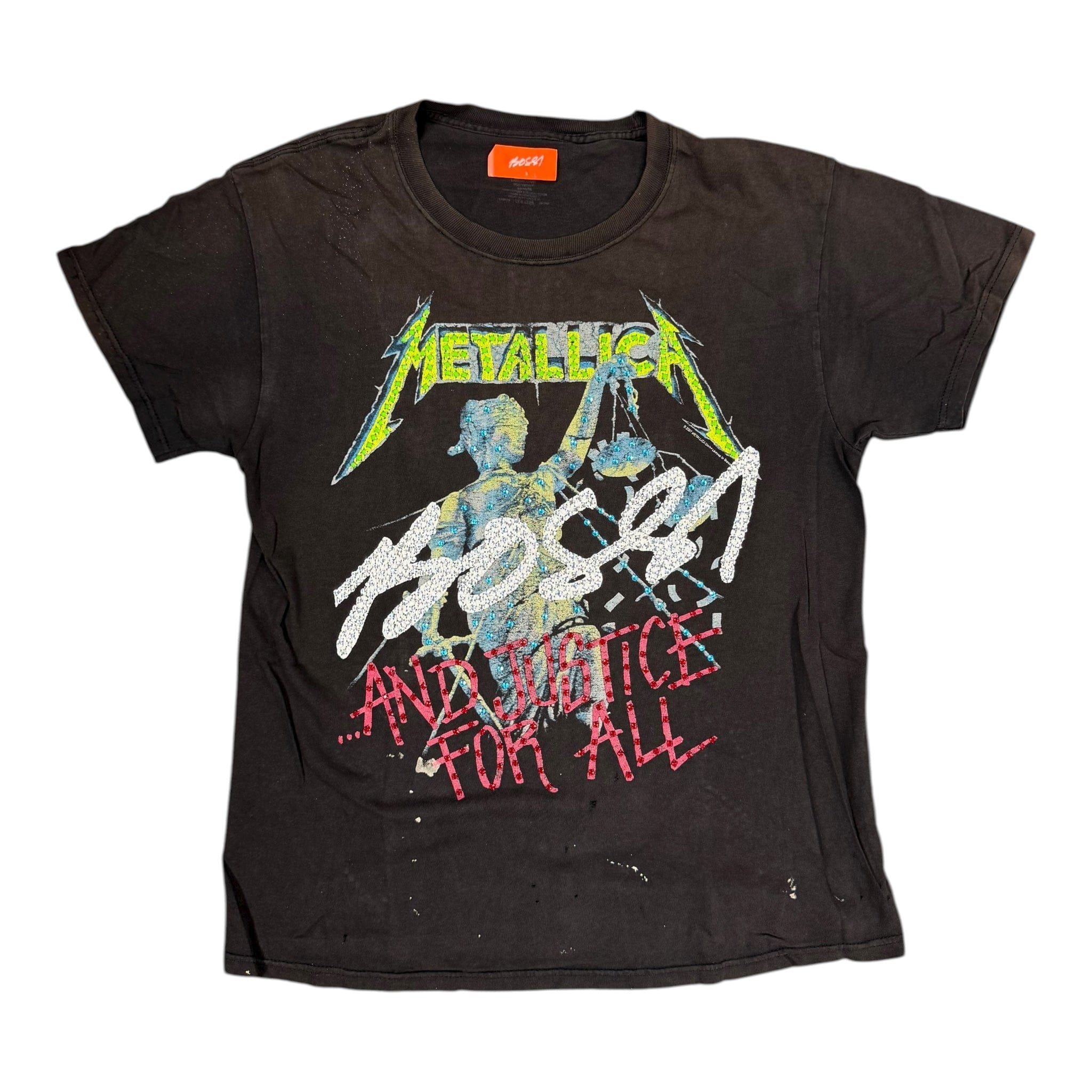 Bossi Metallica And Just For All Rhinestone Studded Vintage Short Sleeve Tee Shirt Black Multi