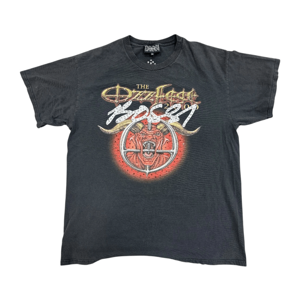 Bossi Rhinestone Studded Ozzfest 2000 Logo Short Sleeve Tee Shirt Black Yellow Multi