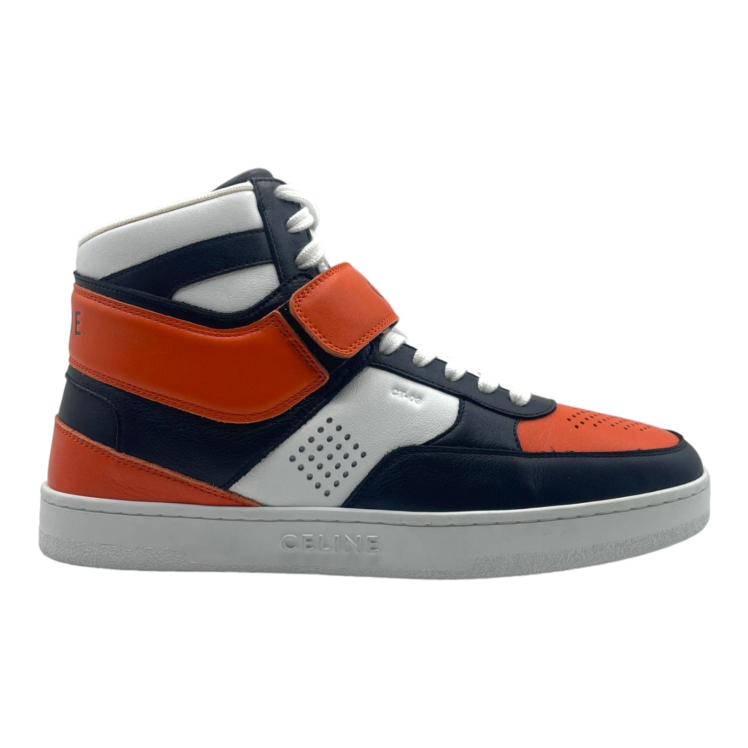 Origins NYC offers this new pair of Celine Calfskin CT-03 High Top Sneakers in Orange and Black.