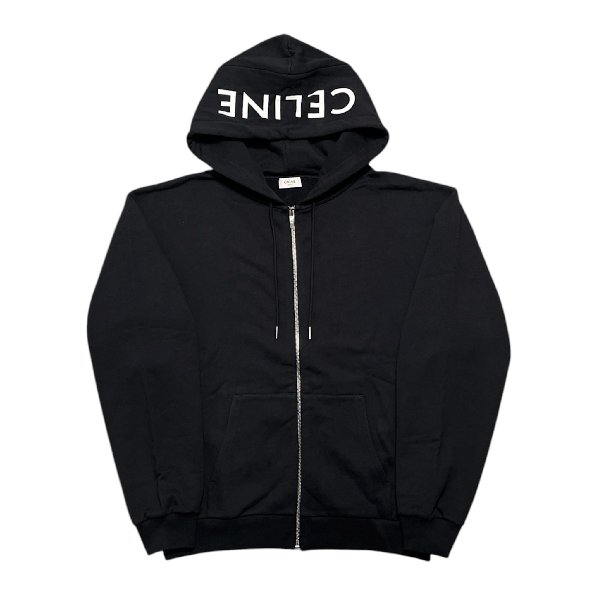 Celine Hood Logo Zip Up Hooded Sweatshirt Black White