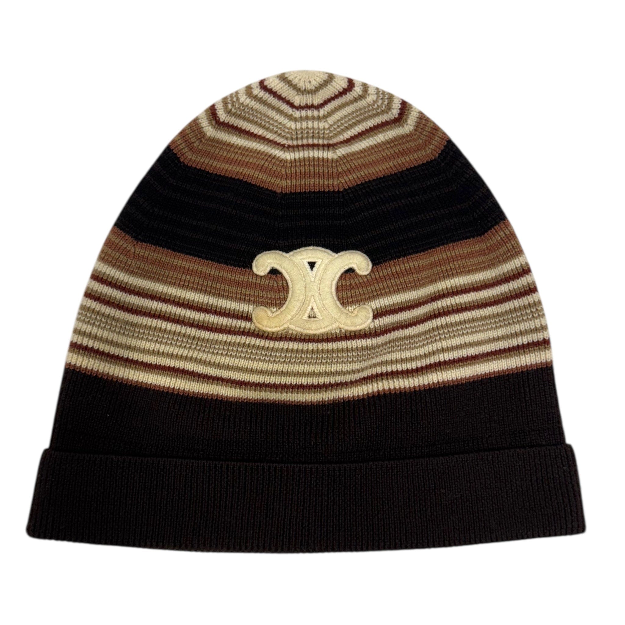 Celine Embroidered Triomphe Logo Striped Beanie Brown Khaki White