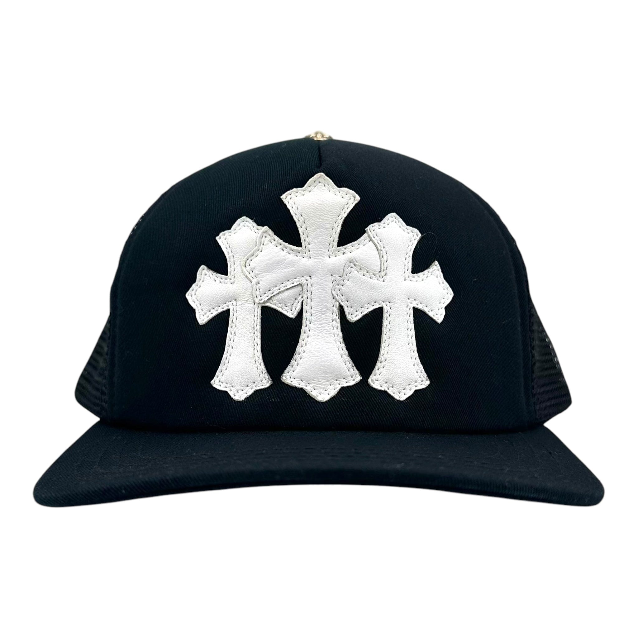 Chrome Hearts Cemetery Leather Cross Patch Trucker Hat Black White