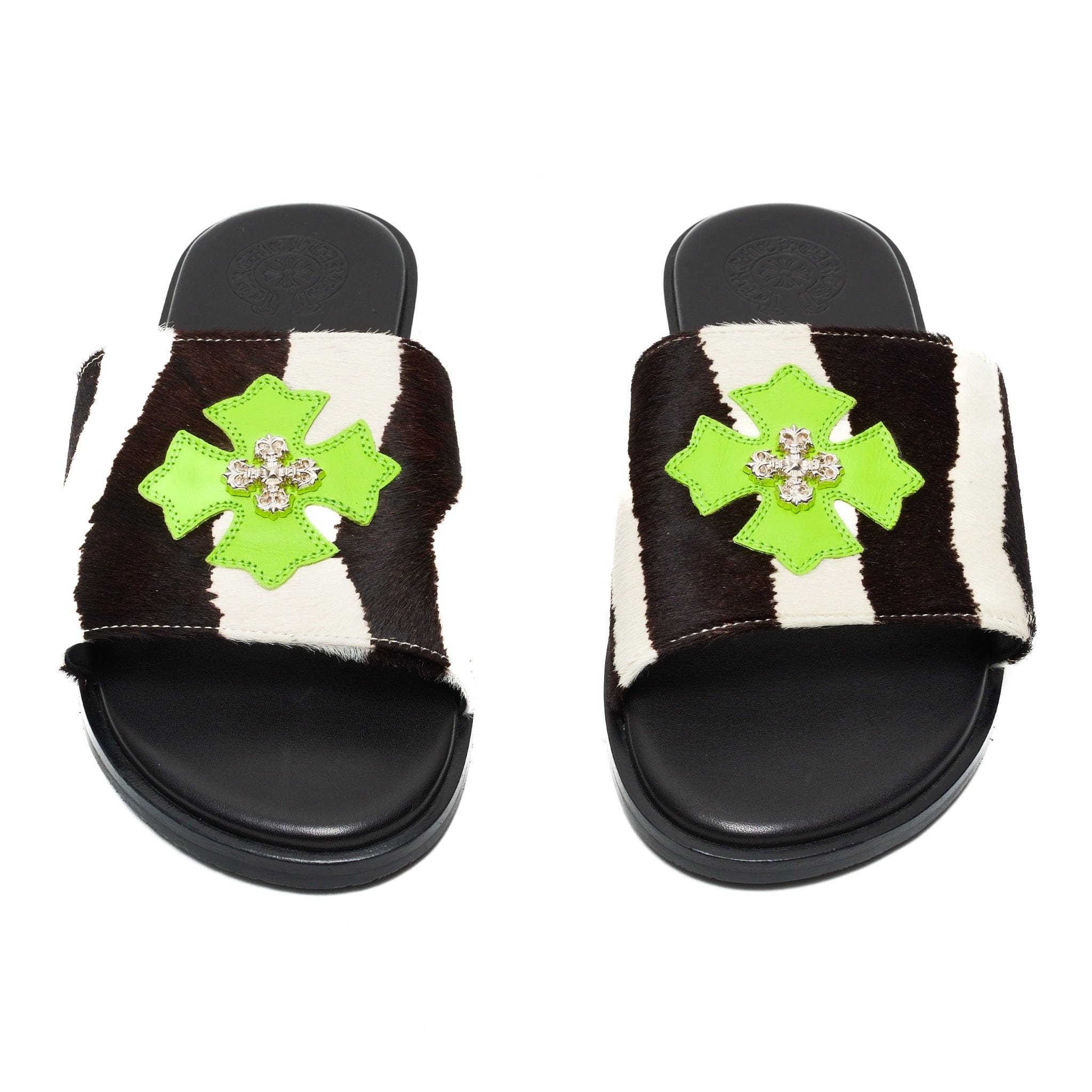 Chrome Hearts Cross Patch Cowhide Leather Slide Sandal Black White Neon Green (Silver)