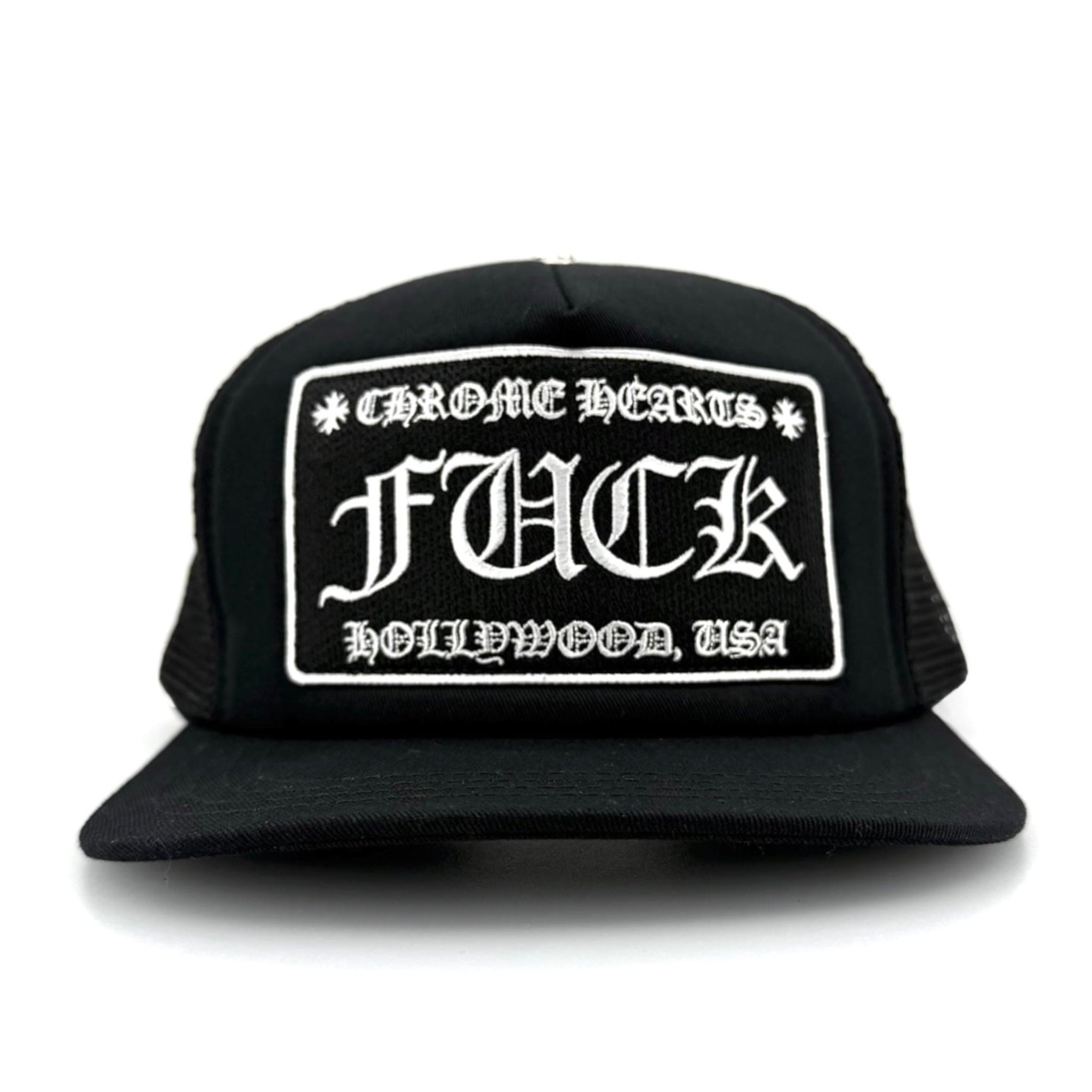 Chrome Hearts Hollywood Exclusive FUCK Patch Trucker Hat Black White