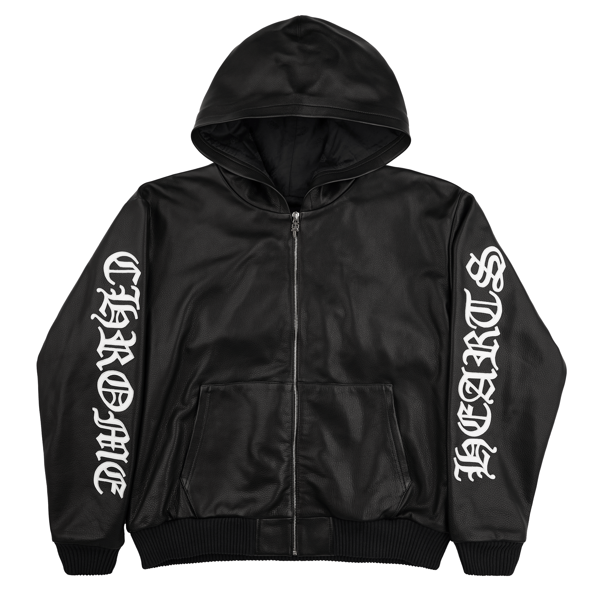 Chrome Hearts Leather Patch Leather Zip Up Hooded Jacket Black White