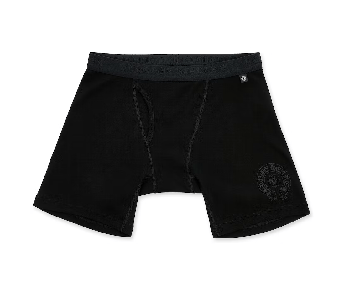 BLACK COTTON BOXER BRIEF WITH BLACK TONAL JACQUARD KNIT CHROME HEARTS ELASTIC WAISTBAND SCROLL DETAIL AT LEG BODY 100% COTTON WAISTBAND 52% NYLON, 33% POLYESTER, 15% POLYURETHANE PLEASE NOTE THIS STYLE RUNS SMALL MADE IN JAPAN