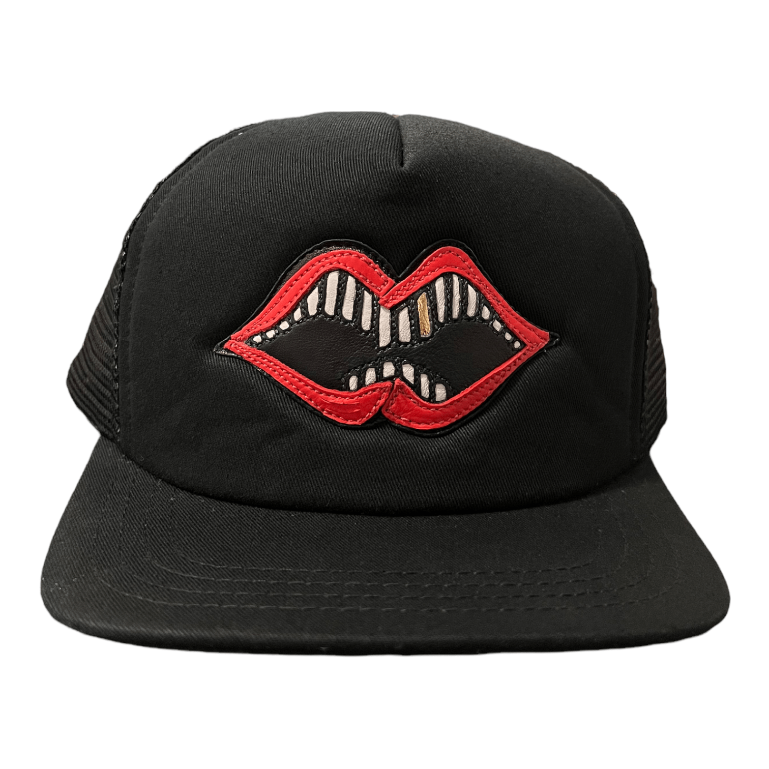Chrome Hearts Matty Boy Leather Chomper Logo Patch Trucker Hat Black Red