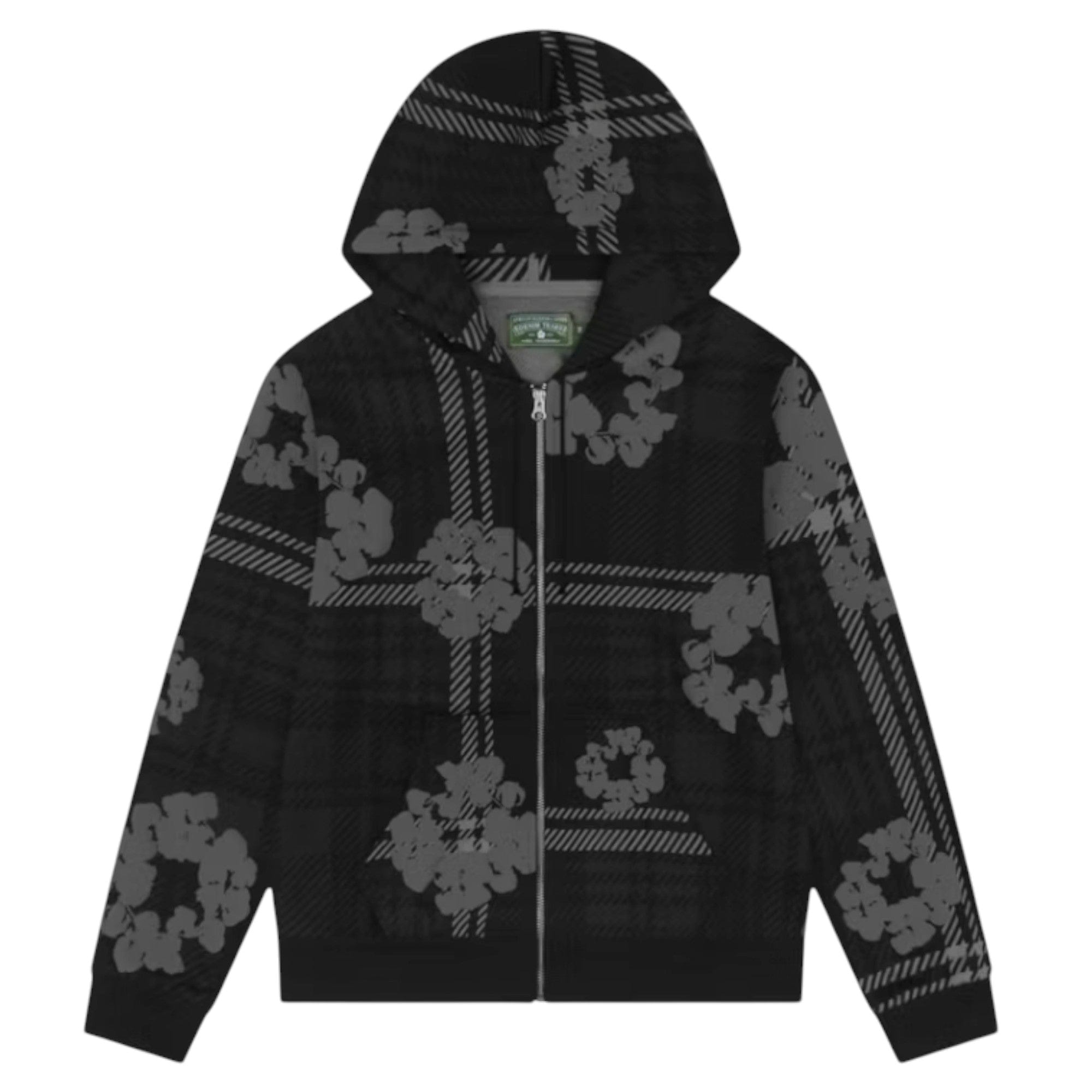 Denim Tears The Cotton Wreath Logo Zip Up Hooded Sweatshirt Plaid Black