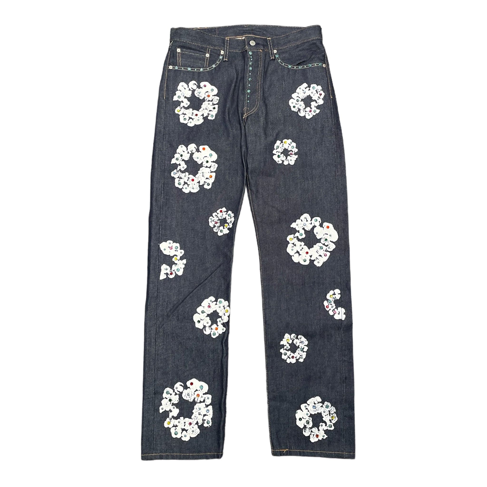 Denim Tears x Levi's 501 Rhinestone Cotton Wreath Logo Jeans Selvedge Indigo White