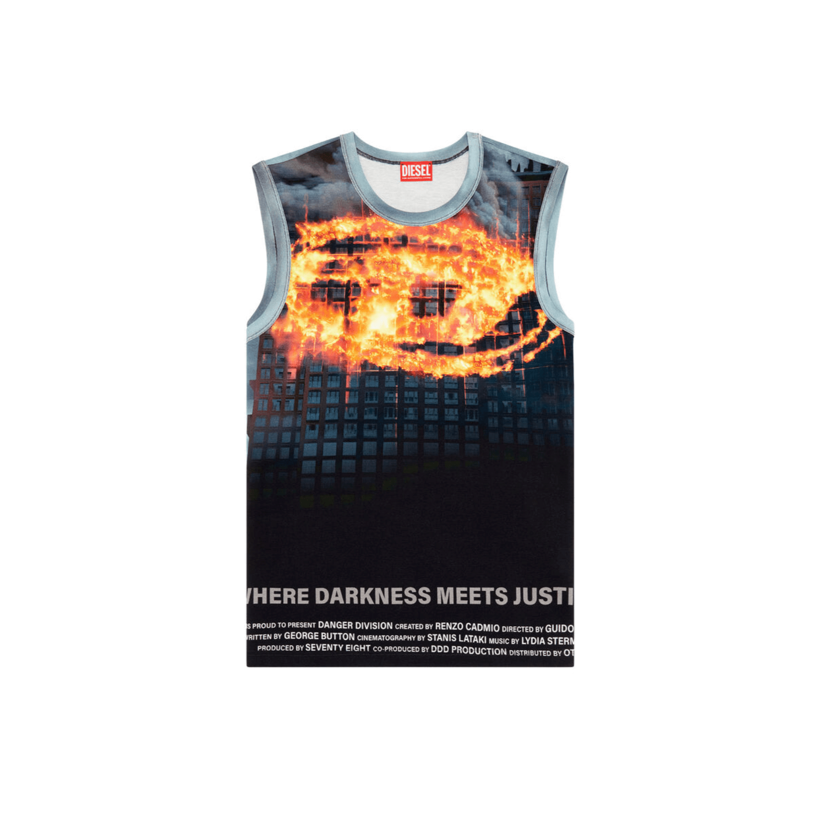 This men's tank top is part of the Spring Summer 2023 Runway Show collection. Made from raw-feel cotton jersey, it's printed all-over with a fictional Diesel film poster, depicting a burning building with blazing Oval D logo.