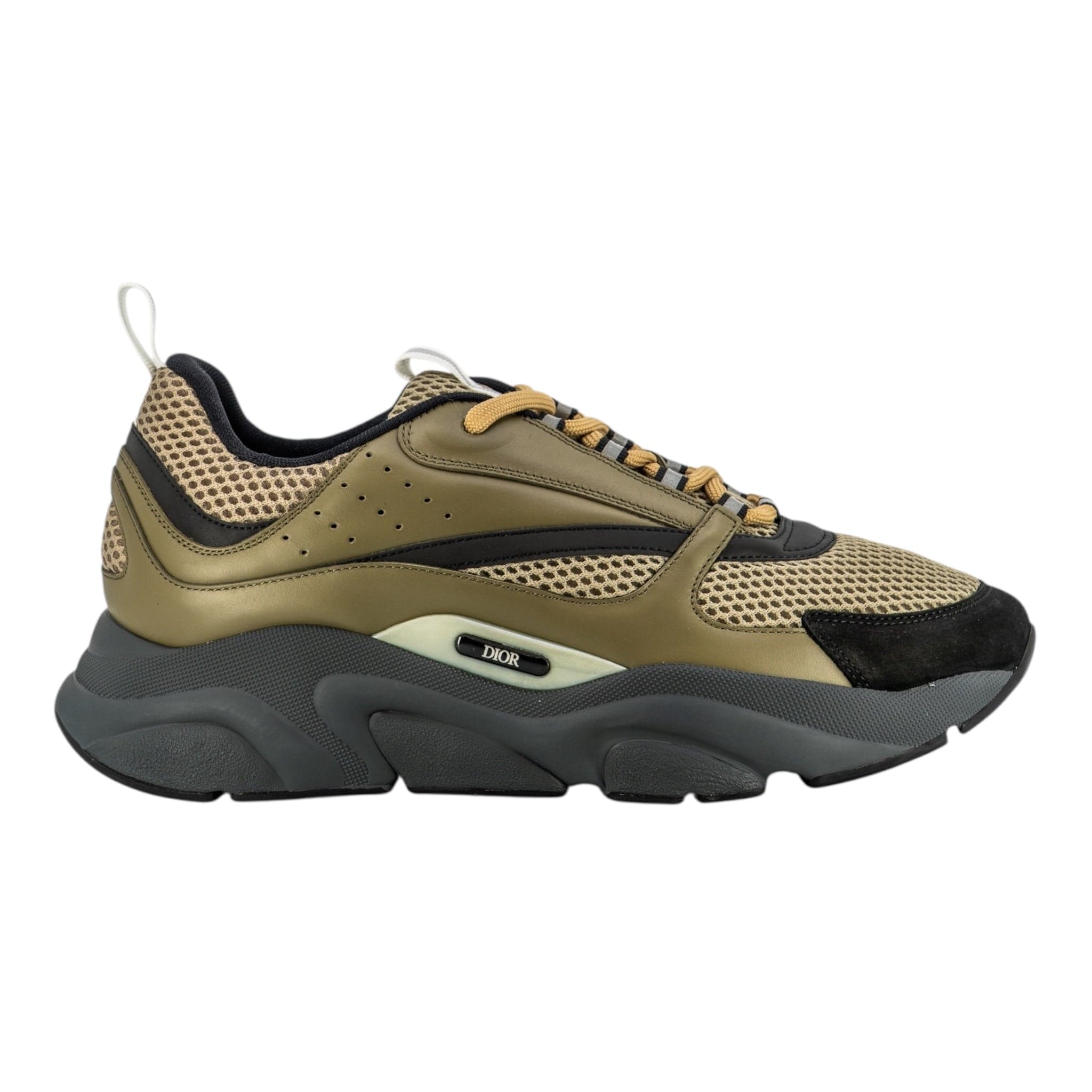 The B22 sneaker reimagines the chunky sneaker through a retro lens. Combining different materials and textures, including khaki smooth calfskin and khaki and black technical mesh, it has a bold, sportswear aesthetic. Round laces and a raised Dior signature on the side complement the thick anthracite gray sculpted rubber sole. The sneaker can be worn with any casual piece for a sporty and contemporary silhouette.