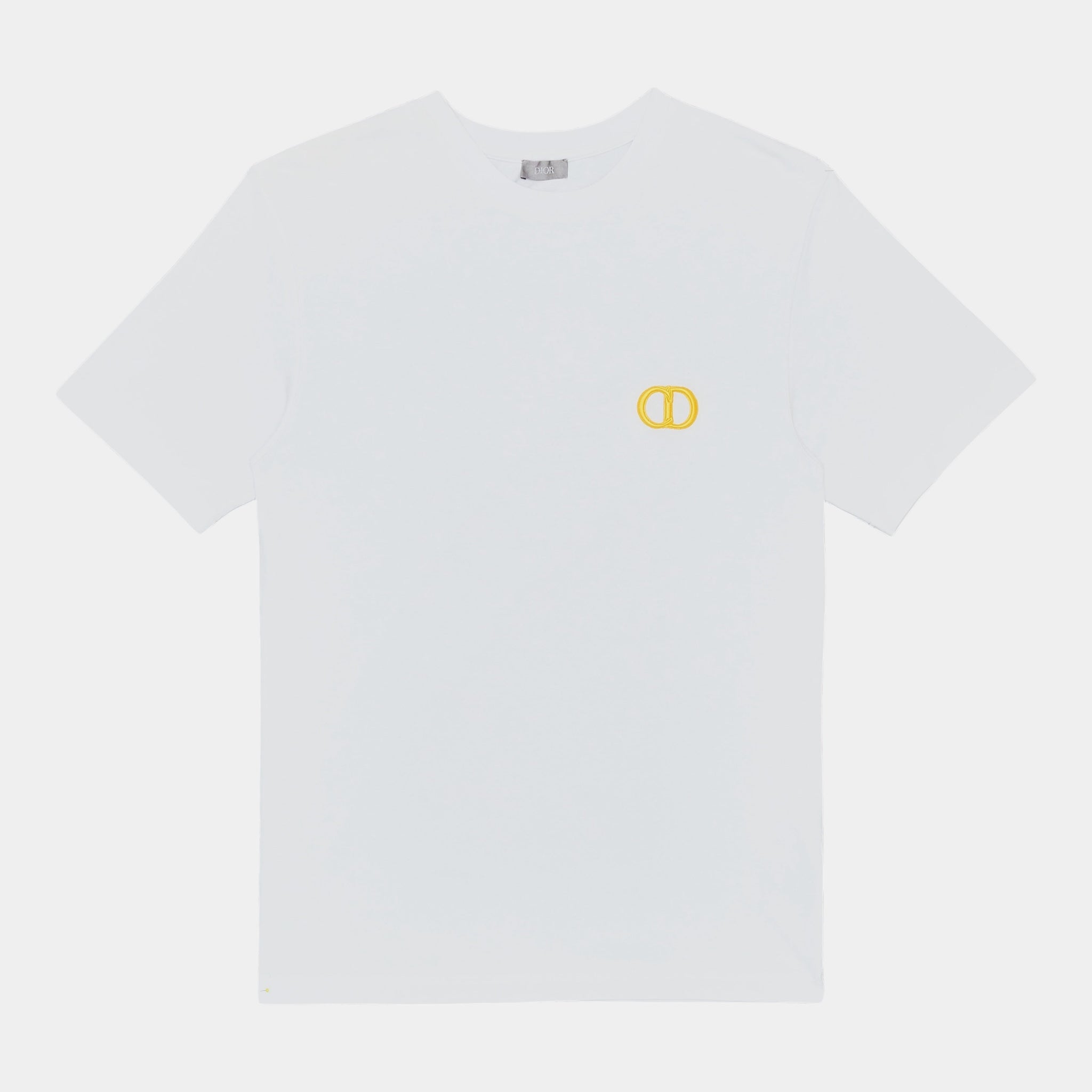 Dior CD Icon men's t-shirt in white with contrasting CD logo embroidered on the front in yellow. The t-shirt is made of high-quality cotton and pairs well with casual and sportswear attire. Made in Italy