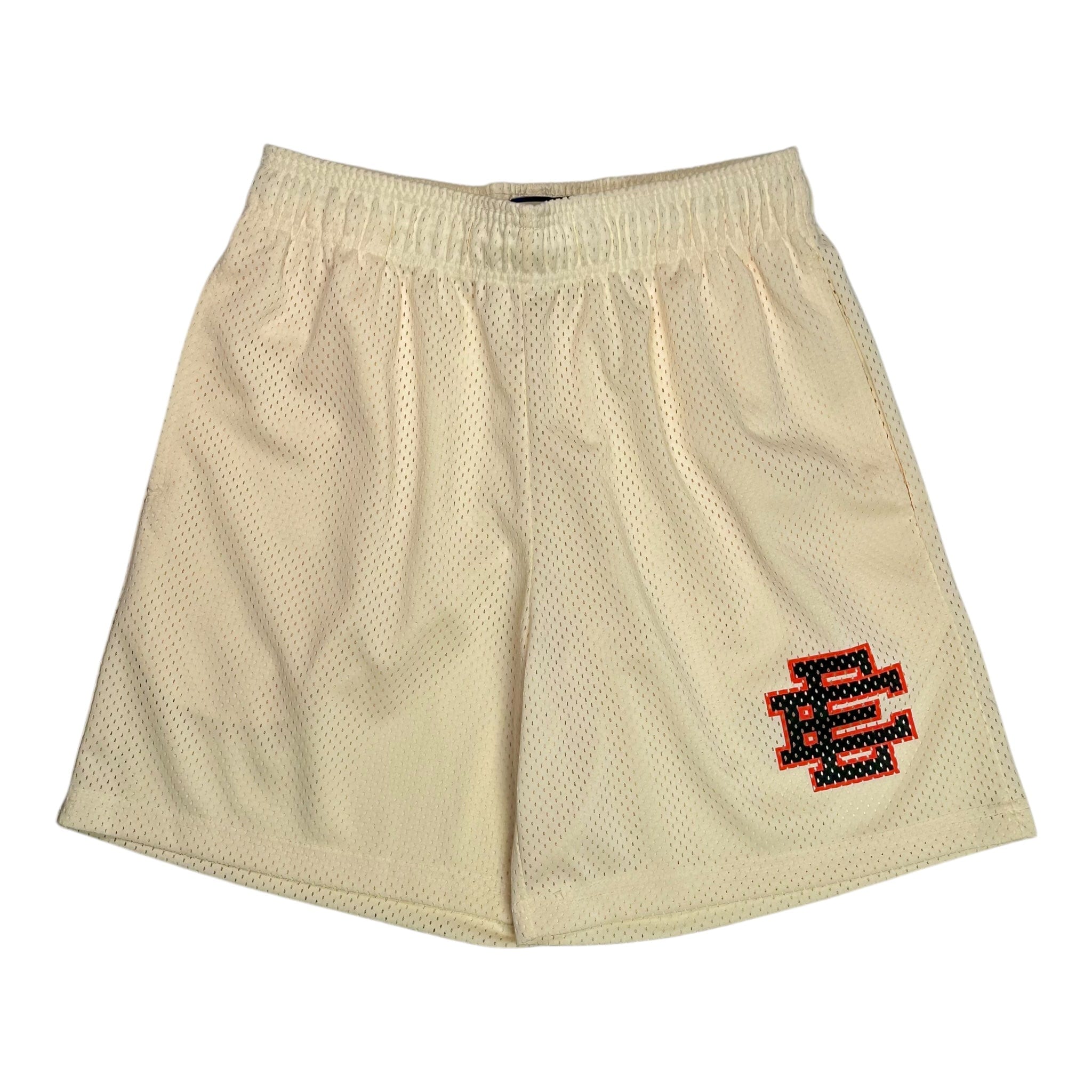 The Eric Emanuel EE Basic Short Antique White Black features an adjustable waistline that has two drawstrings and pockets. This short is quick to dry and breathable due to its polyester mesh material, and it has a logo labeled twice "E" on the left side of the short with an orange highlight. It comes in a new and authentic condition.