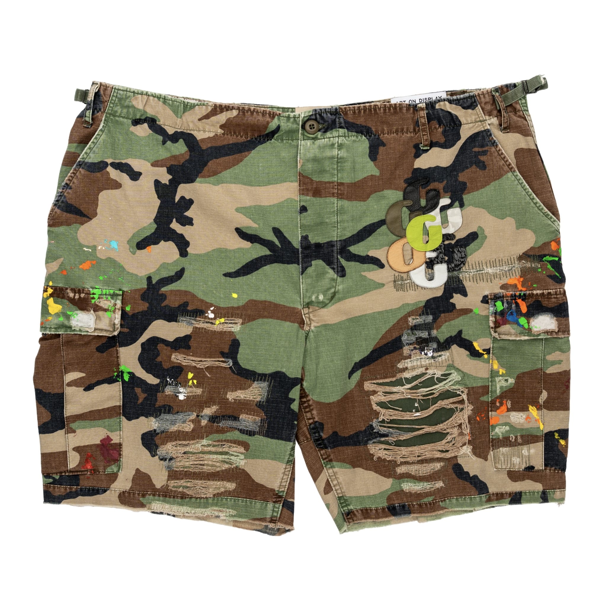 These shorts are made from vintage cargo pants. These are hand painted with added G patches on each pair.