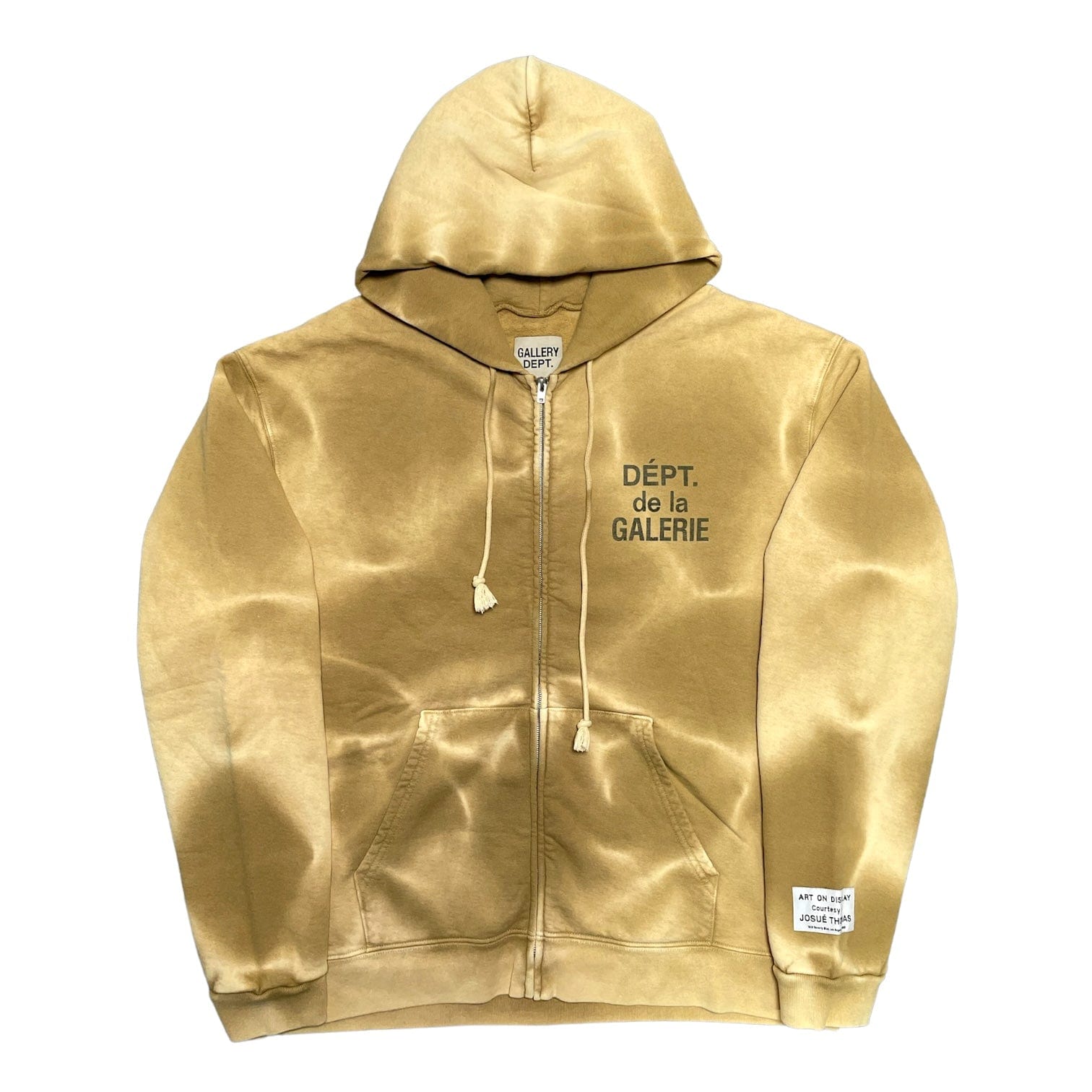 Loopback cotton-jersey zip-up hoodie in tan with a 'sun-fade' wash achieved through our artisanal dye processes. Each hoodie has been adorned with our French Logo typographic on both sides, and appliquéd with our 'art on display' patch by the cuff.