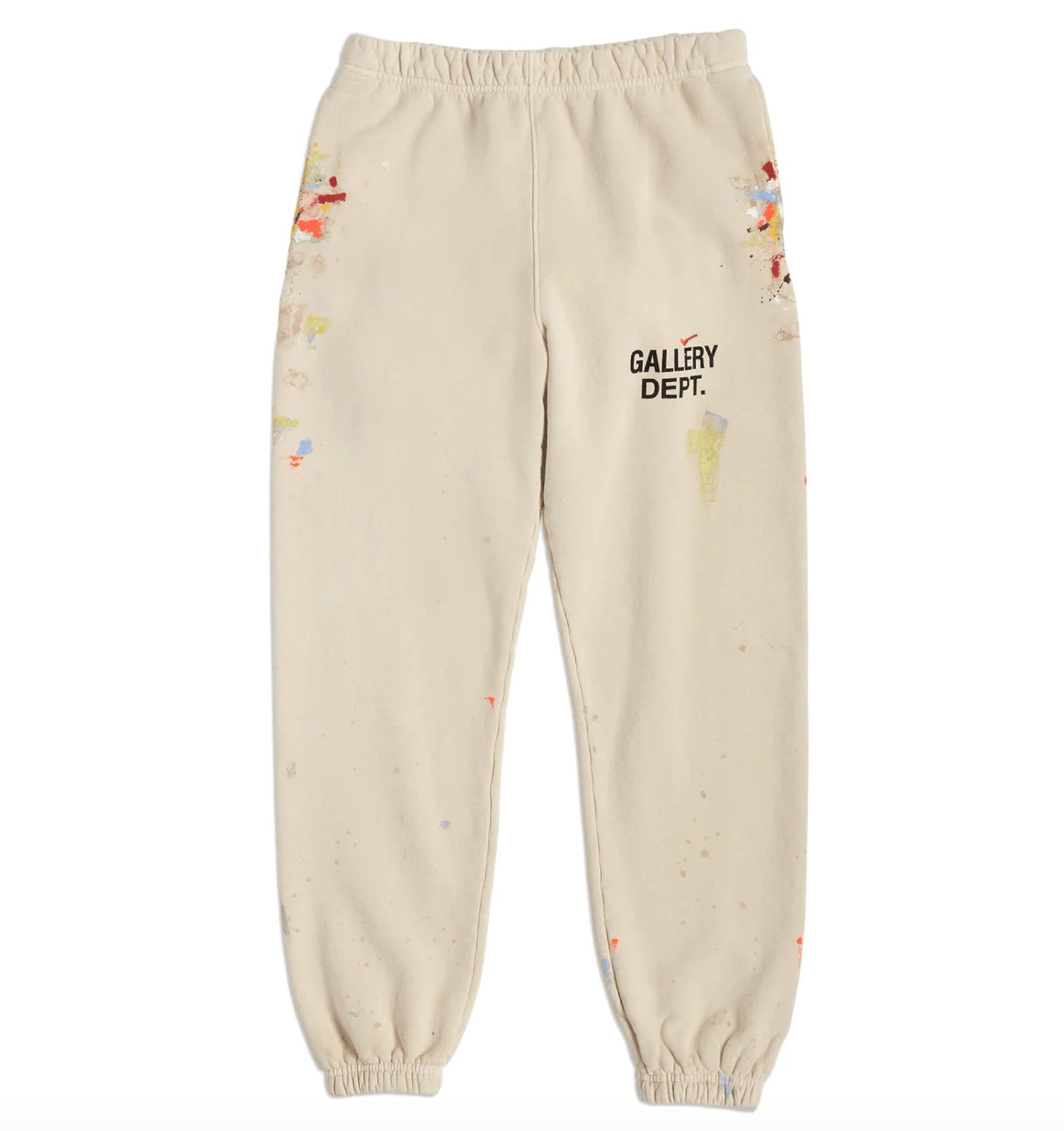 Cotton fleece sweatpants with reinforced cuffs and waistband; finished with hand painted detailing along the hemline.
