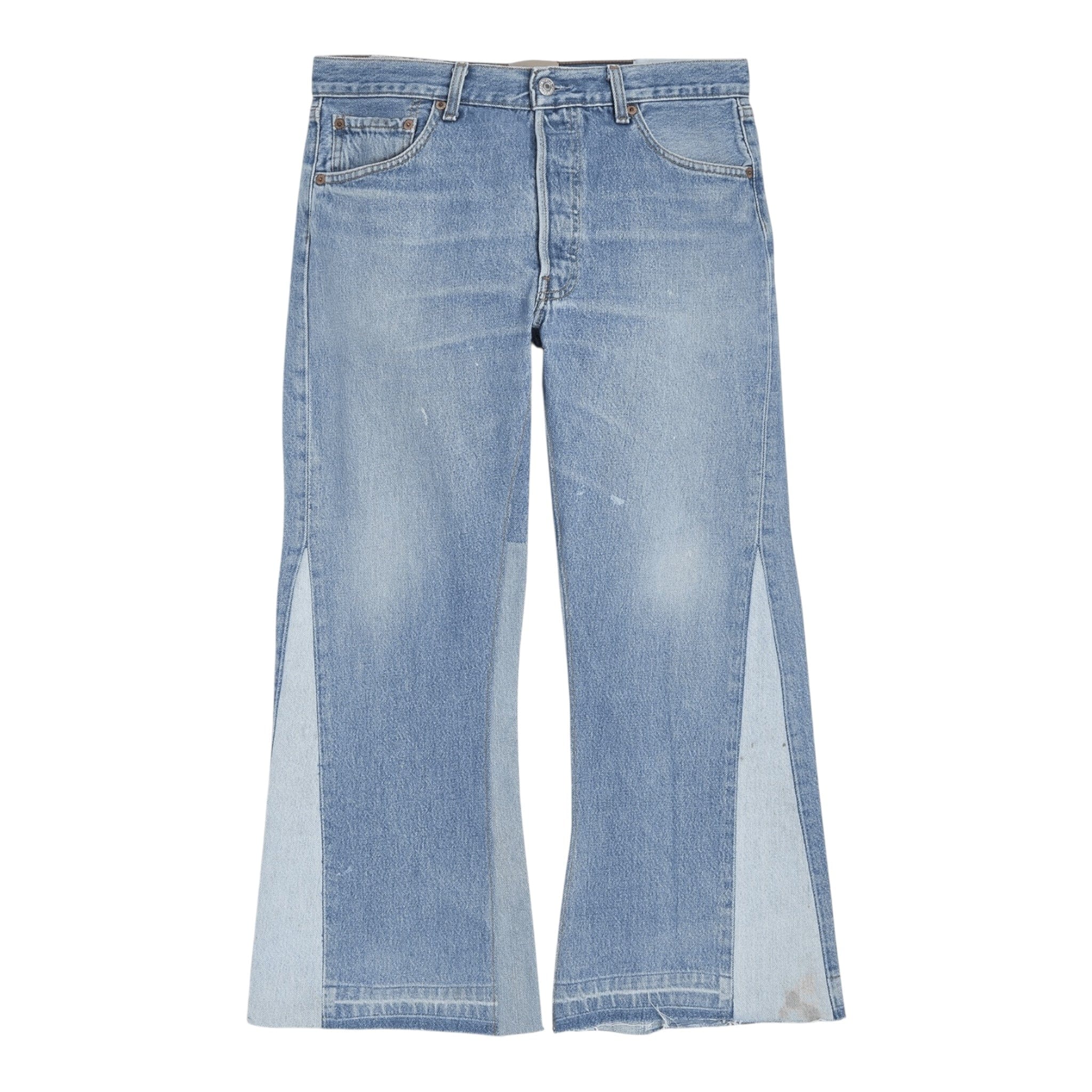 The LA FLARE is one of our quintessential models; personified by its prominent side-seam panels made from recycled denim. These extensions render the 'flare' silhouette, which drapes and billows over the wearer's feet. This particular iteration is made from lighter denim; specifically 501s with an indigo hue.