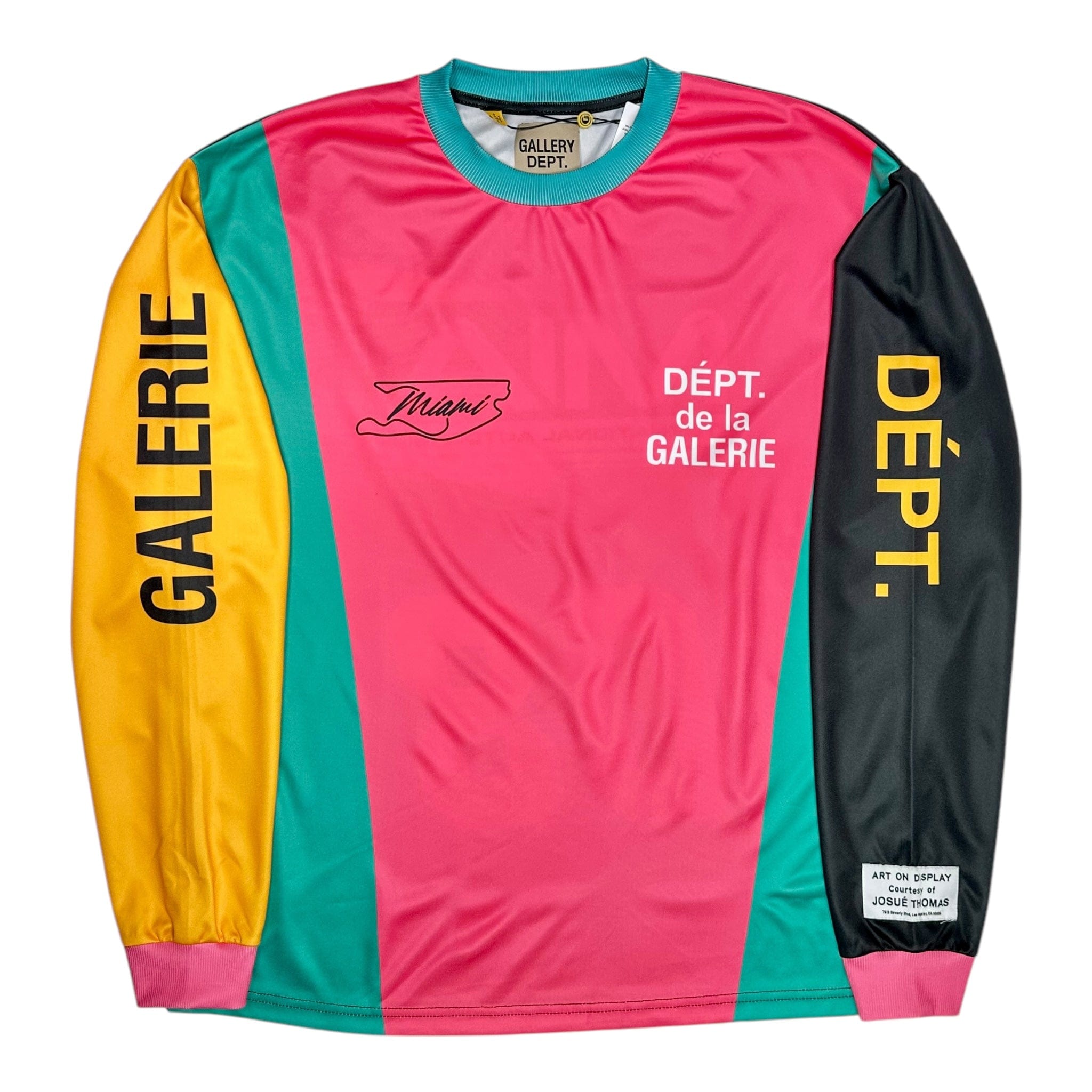 This motorway inspired long sleeve jersey comes in a multi colorway -- adorned with our signature FRENCH logo and Miami logo on the front and the MIA logo and racing number on the back, finished with our GD ENGLISH logo printed on the sleeves. The colorful jersey is a boxy silhouette cut.