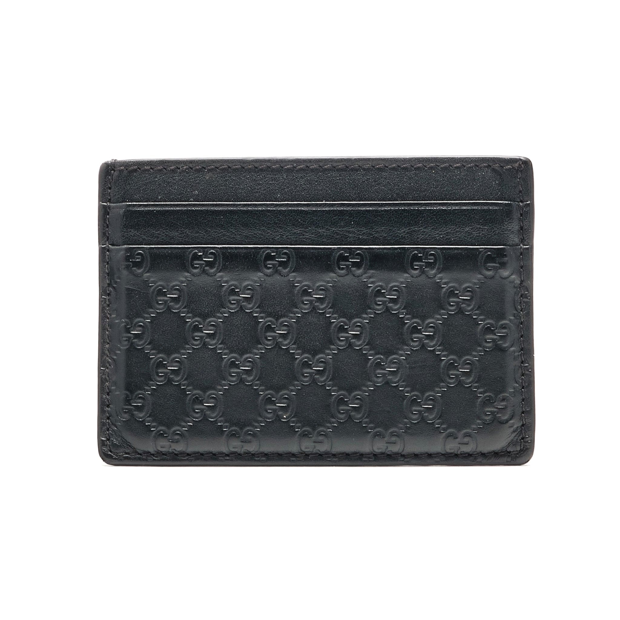 Gucci Signature Leather Card Holder has an interior leather lining, and it features four card slots and a center slip pocket. The Gucci Signature Leather Card Holder (black) was released in 2022 for a retail price of $150.
