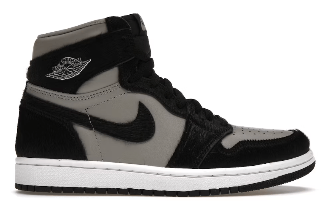 The materials used in the construction of this High Air Jordan 1 for women (W) include leather, synthetic hair, and rubber. It has a round toe, a perforated toe cap, and black overlays of synthetic hair. The Swoosh is displayed on its lateral while the Wings logo is on the collar. The soles include AIR Units for cushioning and the outsole has a linear pattern. A crossed-lacing system completes the design.