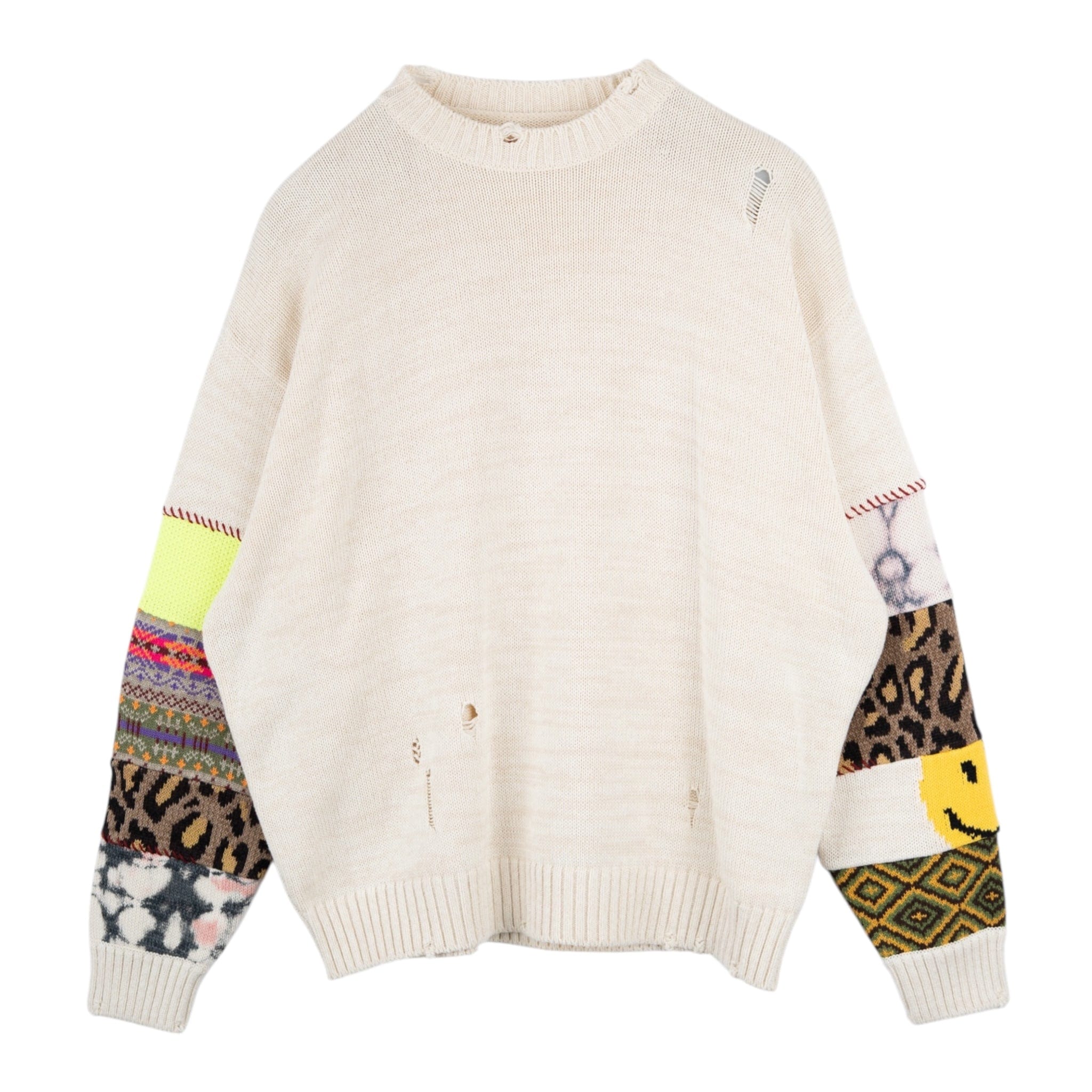 Kapital Hippie Sleeve Distressed Knit Sweater Ecru Multi