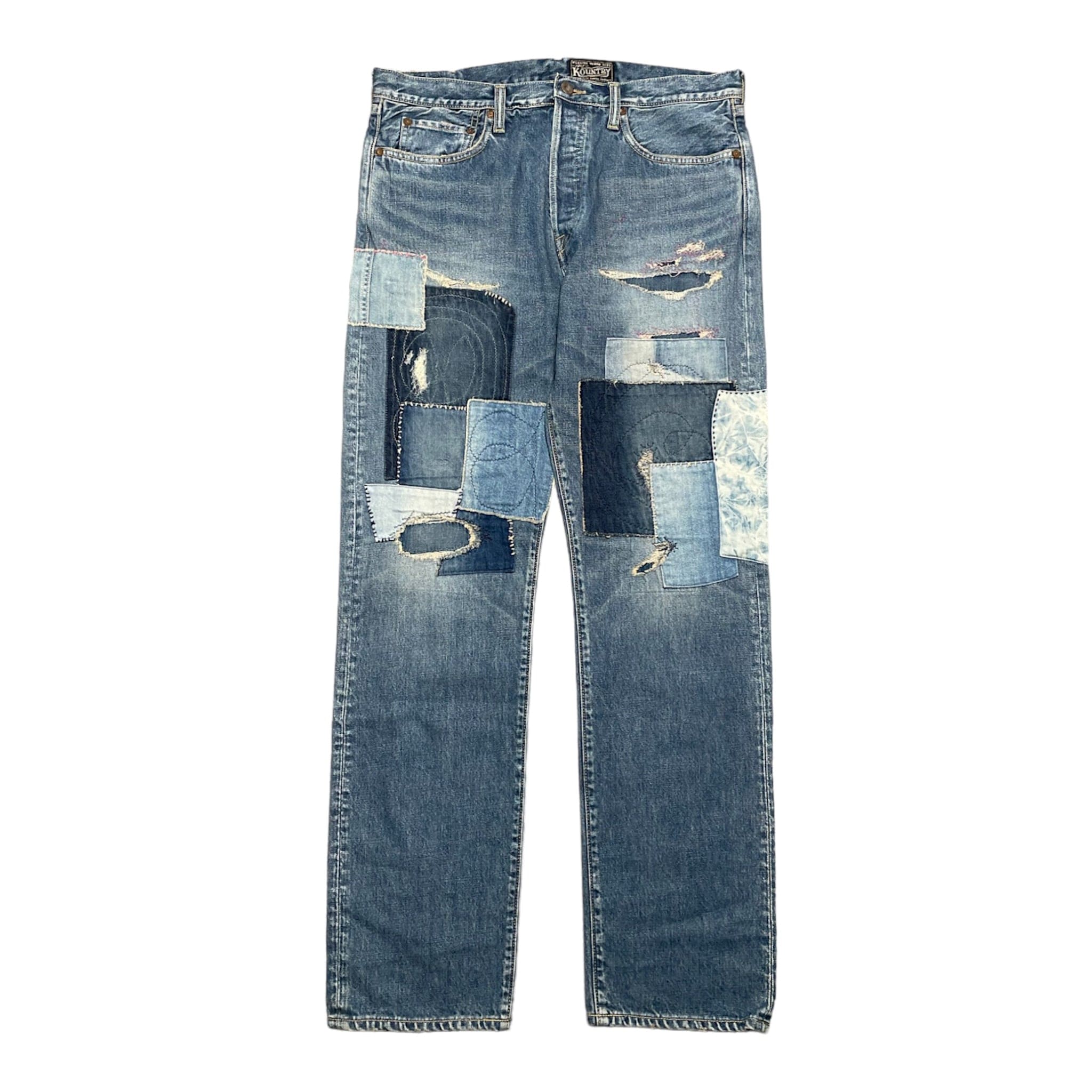 Working from their iconic Monkey Cisco fit, which is a higher rise and a great taper from the knee down, Kapital has created something really special for this remake version. Starting with a beautifully washed-out indigo denim that comes out as a vintage wash and then they really get to work. Kapital has hand-distressed the whole thing and then carefully hand-stitched repairs to create a precise, but artful piece of denim art that really stands out in boro style and unique patches.