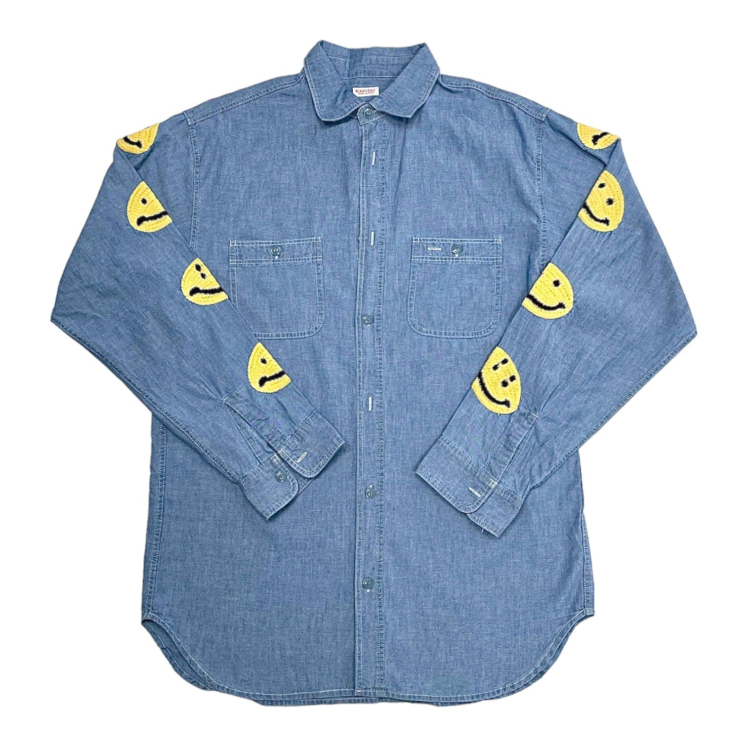 A refreshing chambray work shirt with a smile embroidered on the sleeve. A design with smiles lined up on the sleeve in the hippie embroidery atmosphere found in vintage western shirts and work shirts.