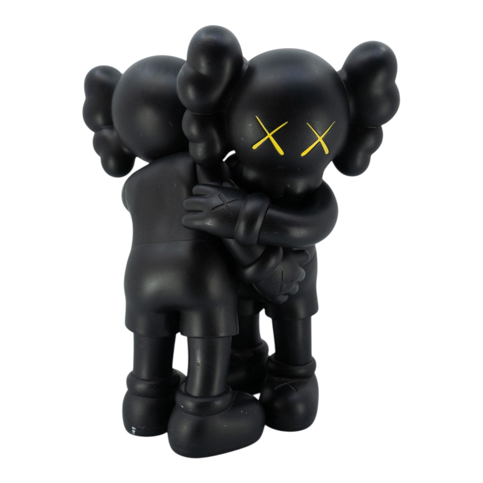 The latest rendition of KAWS' famous Companion, this Together Figure in Black released on June 12th, 2018 exclusively through KAWSONE. Prior to its release, large scale Together sculptures were on display at KAWS exhibitions at the More Gallery in Switzerland and the Modern Art Museum of Fort Worth in Texas during 2016. The figure features two interlocked Companions hugging, and stands at 11.5 inches tall. Each figure was sold at a retail price of $310. The vinyl is stylized in an all-black design with KAWS' classic eye motif highlighted in yellow. Place a bid today and cop a Together figure for your collection.