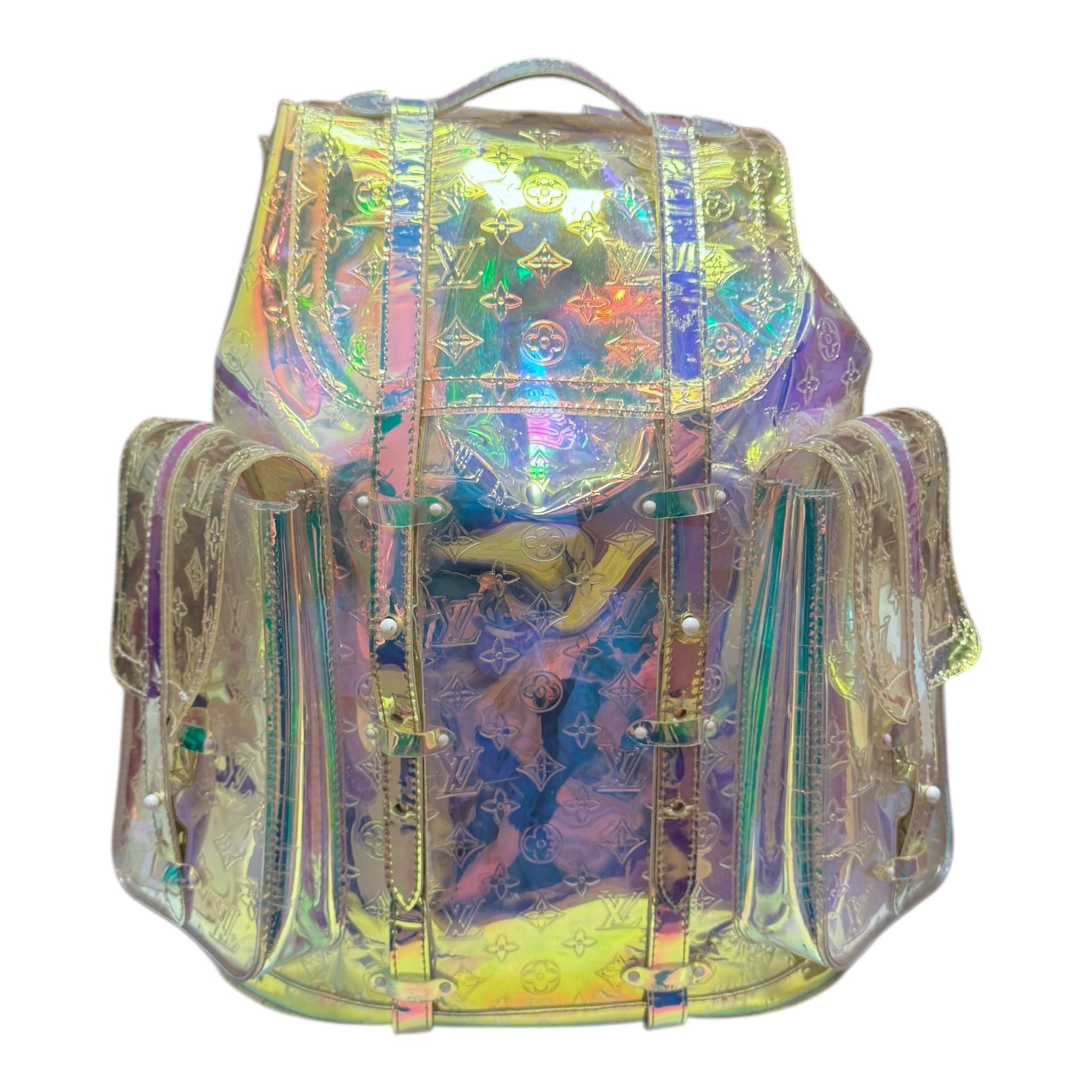 From Louis Vuitton’s highly anticipated Fall/Winter ‘19 collection, the mesmerizing GM Prism Christopher backpack features a holographic LV monogram against an iridescent PVC material and matted, white hardware.