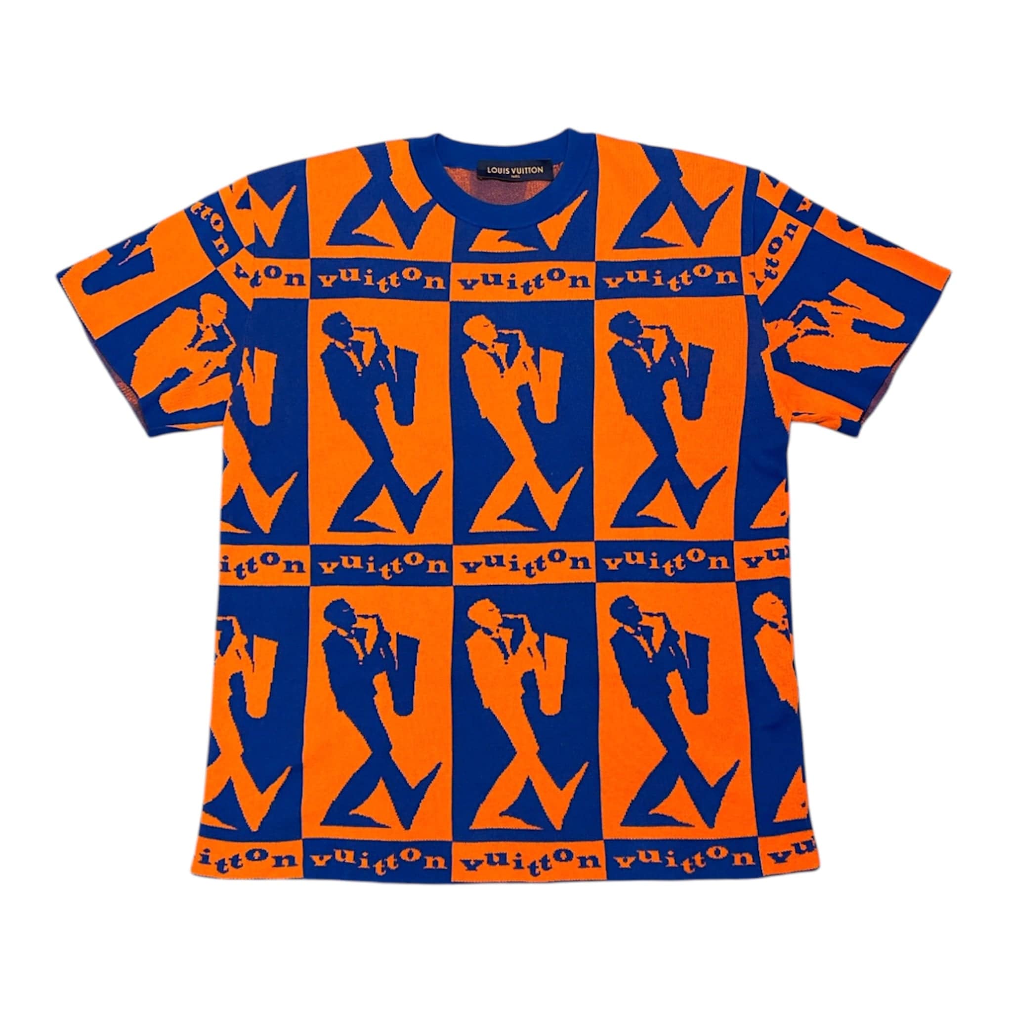 This standout t-shirt in contrasting complementary colors brings a retro modernist twist to this story’s LV Jazzman motif. It features repeated silhouettes of a stylized musician whose body spells out a discreet LV. The motif is integrated into the fine compact knit organic cotton with a jacquard weave.
