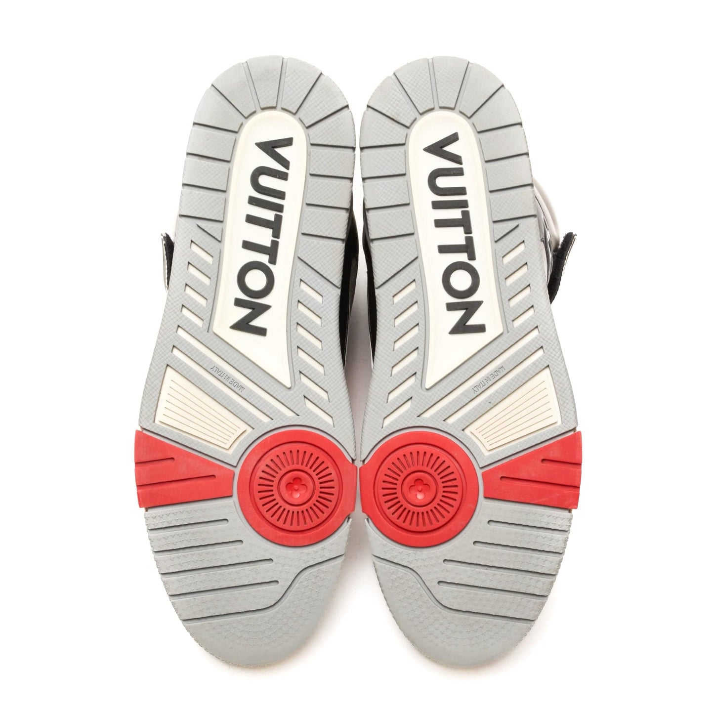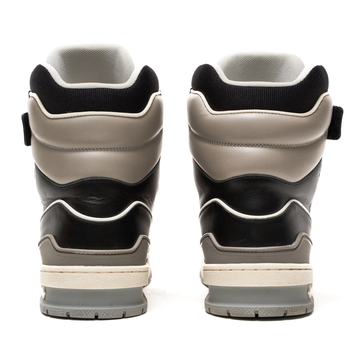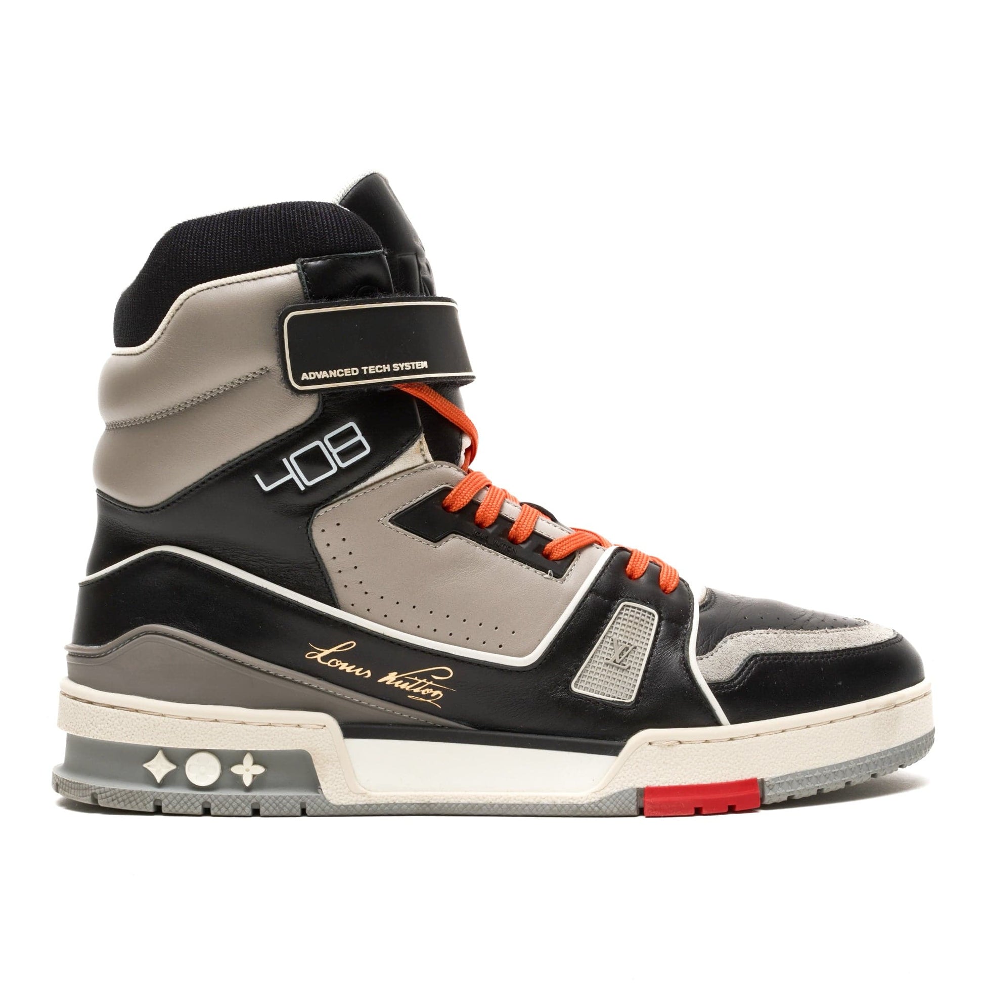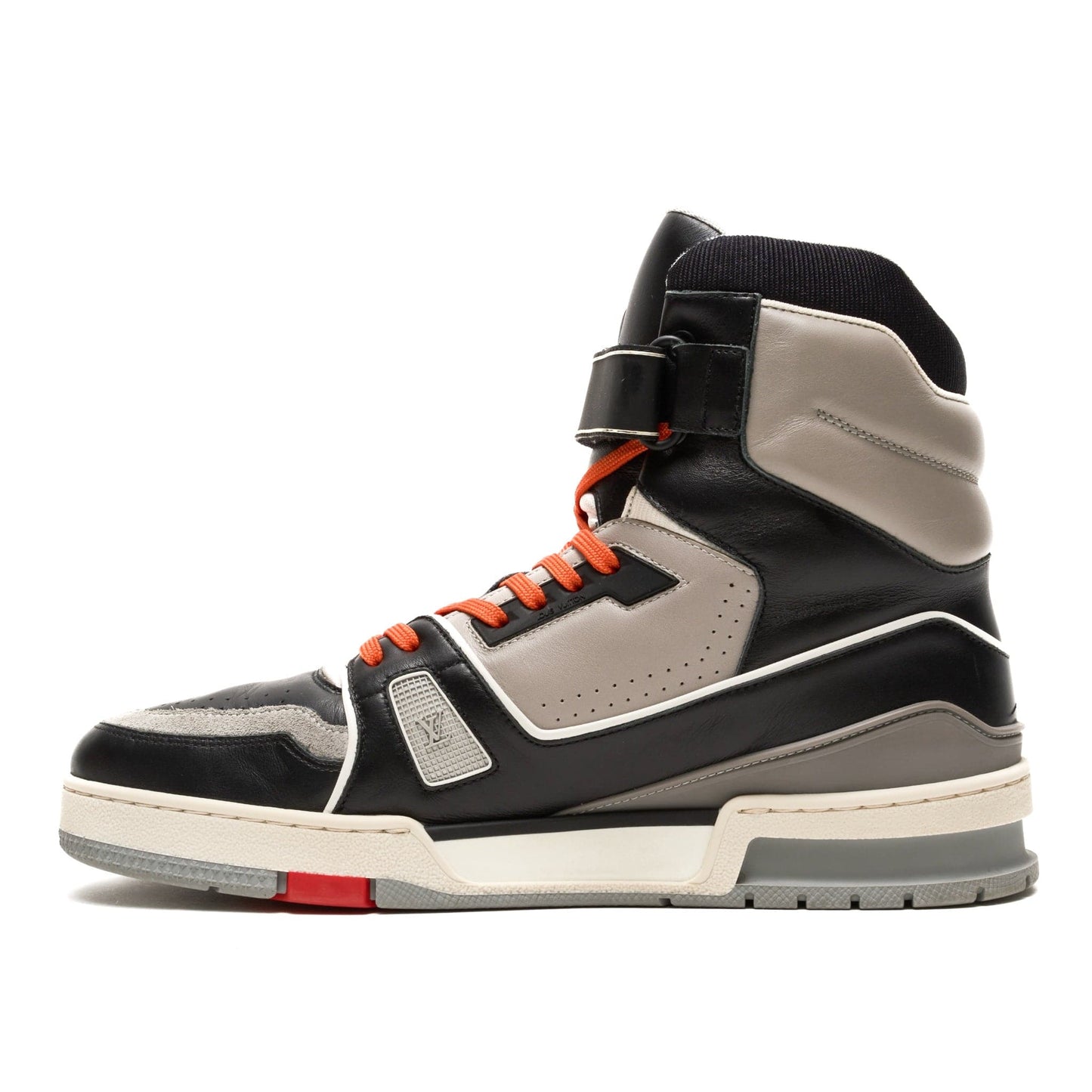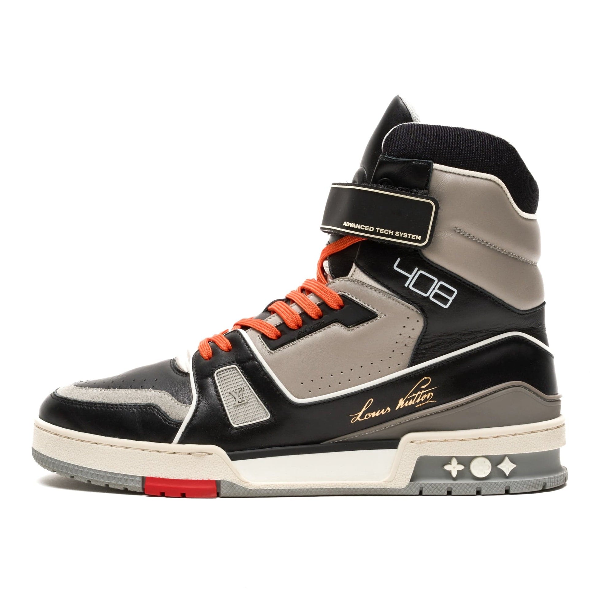One of the standout looks of the Spring-Summer 2019 men's show, the LV Trainer sneaker boot is an avant-garde hi-top crafted from black and gray calf leather. It features a padded collar and a velcro strap marked "Advanced Tech System". The Louis Vuitton signature on the side was hand-written by Artistic Director Virgil Abloh.