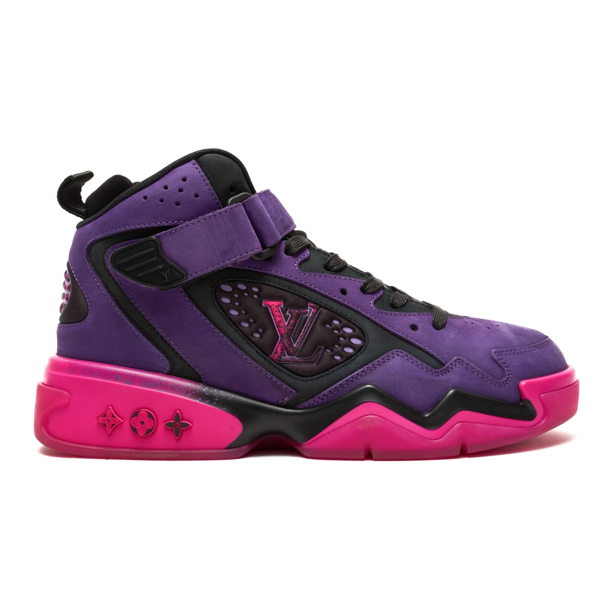 Crafted from suede calf leather, the LV Trainer 2 sneaker was a highlight of Louis Vuitton's Fall-Winter 2022 men's show. Like the original, iconic design by Virgil Abloh, it was inspired by vintage basketball sneakers, which it references with a padded collar, an adjustable velcro strap and an LV basketball signature on the tongue. The bicolor rubber outsole is decorated with Monogram Flowers.