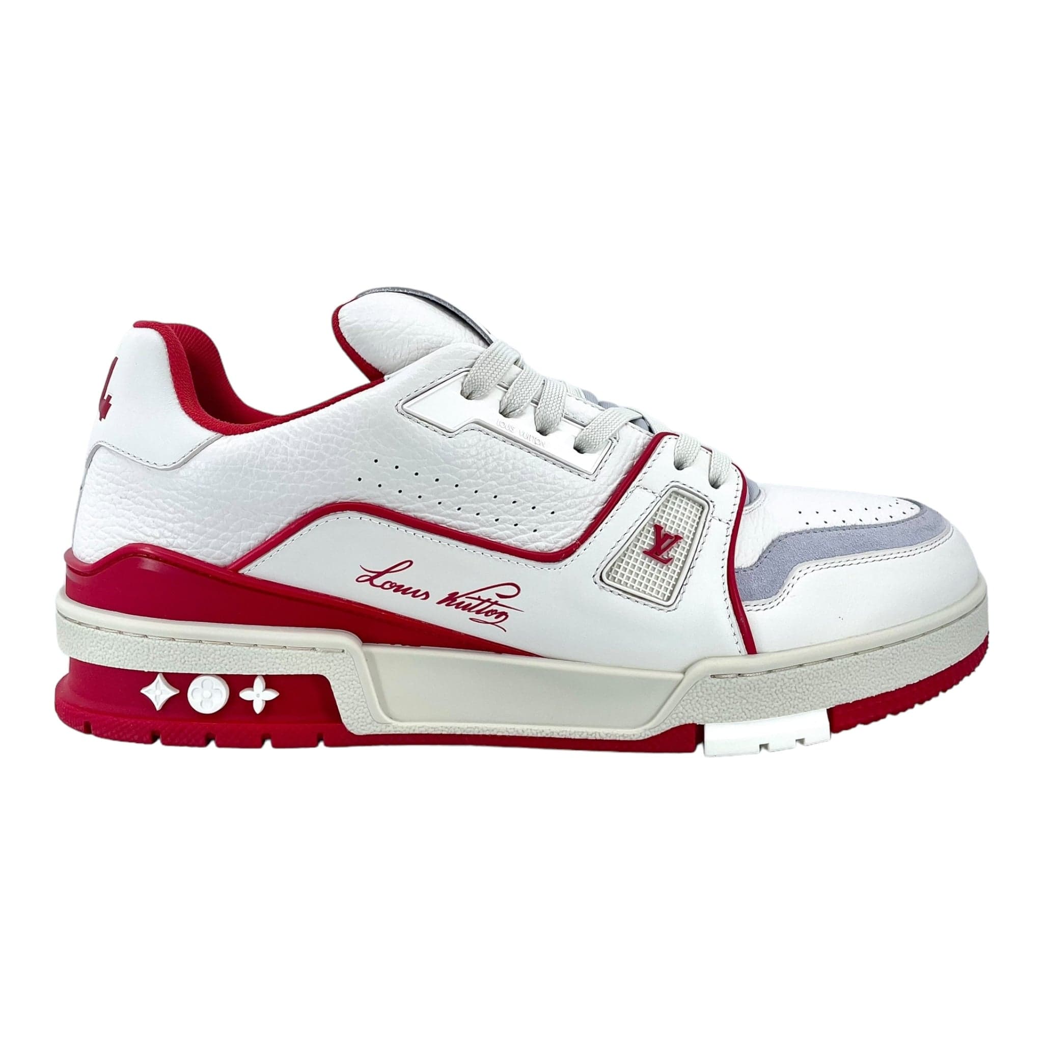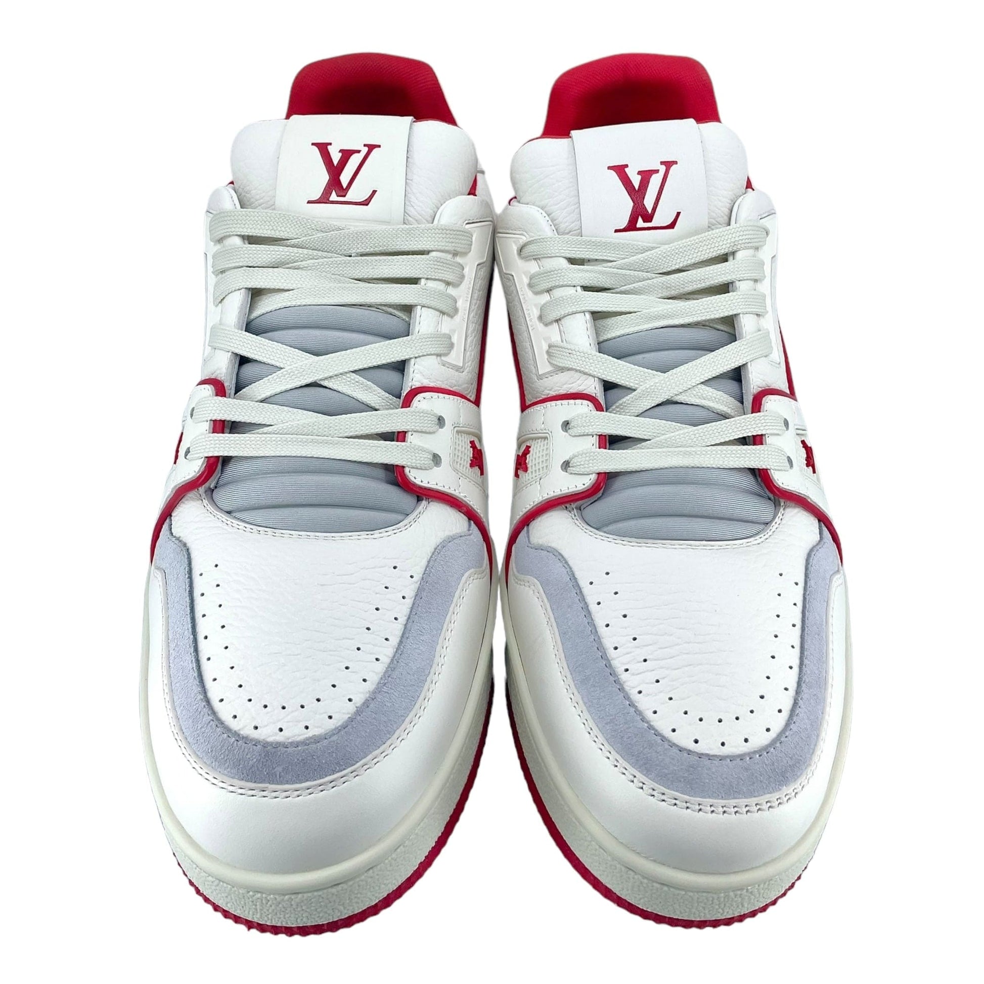 This version of the LV Trainer sneaker is crafted from grained calf leather in a bicolor palette evoking the basketball inspiration of Virgil Abloh's original design. This cult sneaker is notable for its elaborately constructed upper, which takes seven hours to stitch, and for its rich details, including the Louis Vuitton script signature on the side.