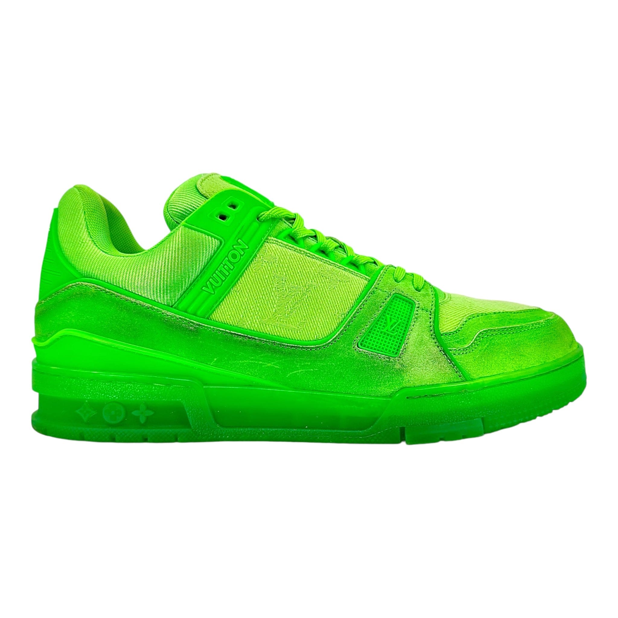 The iconic LV Trainer is reinterpreted in fluorescent green Monogram denim, with matching sole and laces for a color-block look. This model has been designed by Virgil Abloh, artistic director of Louis Vuitton, and is inspired by basketball shoes. An identification tag on the side nods to Louis Vuitton's heritage as a luggage manufacturer.