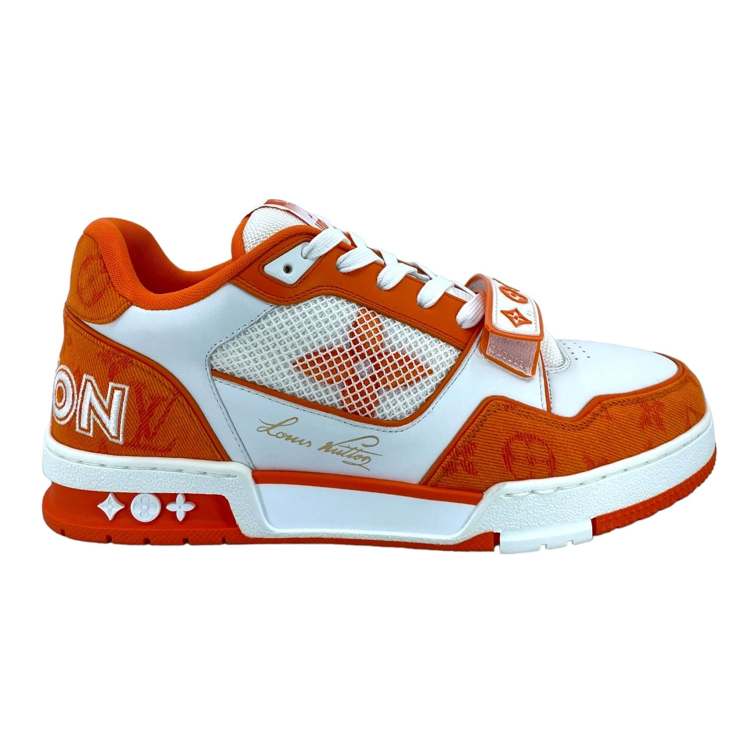Designed for Louis Vuitton by Virgil Abloh, and inspired by vintage basketball sneakers, the LV Trainer sneaker is an icon of the shoe collection. This version comes in Monogram denim and features a velcro strap with injected Monogram Flowers. The elaborate construction of the upper takes Louis Vuitton artisans seven hours to stitch.