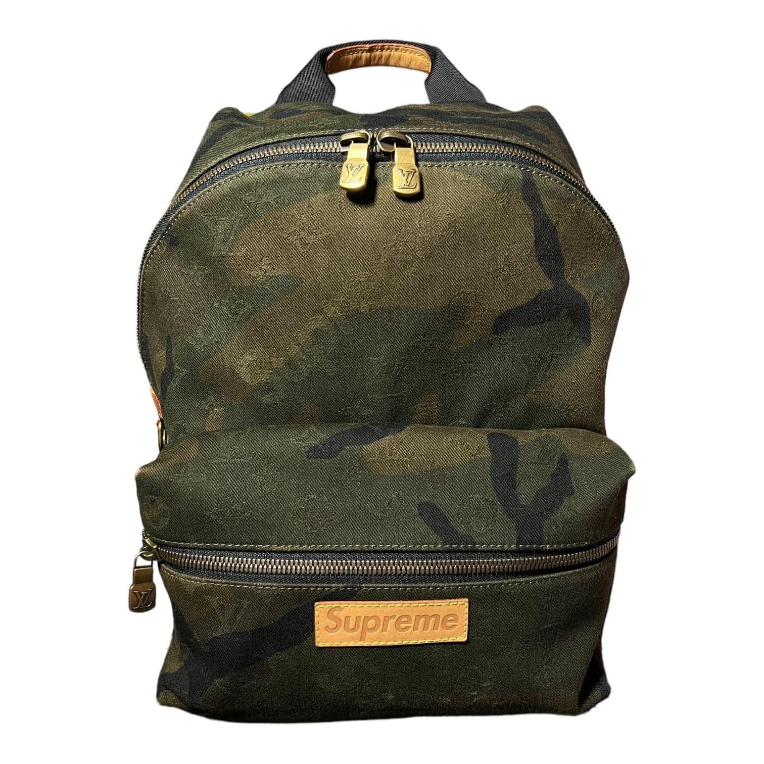 The Louis Vuitton x Supreme Apollo backpack in Monogram Camo is a new take on the classic Louis Vuitton Apollo backpack, except instead of being made with coated canvas, it’s actually constructed from jacquard fabric, with the Monogram pattern intricately woven in. It has a cowhide leather trim, brasstone hardware, a top handle zip closure, adjustable shoulder straps, external zipped front compartment and textile lining. The front pocket features a leather accent with the "Supreme" stamped in Futura Heavy Oblique font. The zipper pulls have the classic Louis Vuitton logo. One of the most highly anticipated collaborations in fashion, the Supreme x Louis Vuitton collection was first unveiled at Paris Men’s Fashion Week in January 2017 and later released in June 2017.