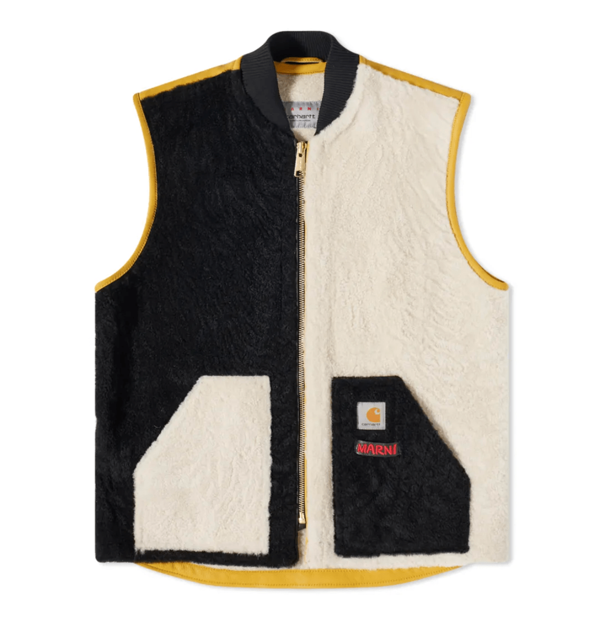 Italy meets America in this unlikely first collaboration between Marni and Carhartt WIP. The new collection takes a lighthearted approach to utilitarian silhouettes, reimagining Carhartt’s signature styles through Marni’s kaleidoscopic lens. This shearling gilet brings a tactile richness to a traditionally rugged style, showcasing Marni’s unique flair for colour and texture. This contrasting colour block design is playful and bold, complete with embroidered ‘MARNI’ lettering and a Carhartt Work In Progress patch to celebrate this innovative union.