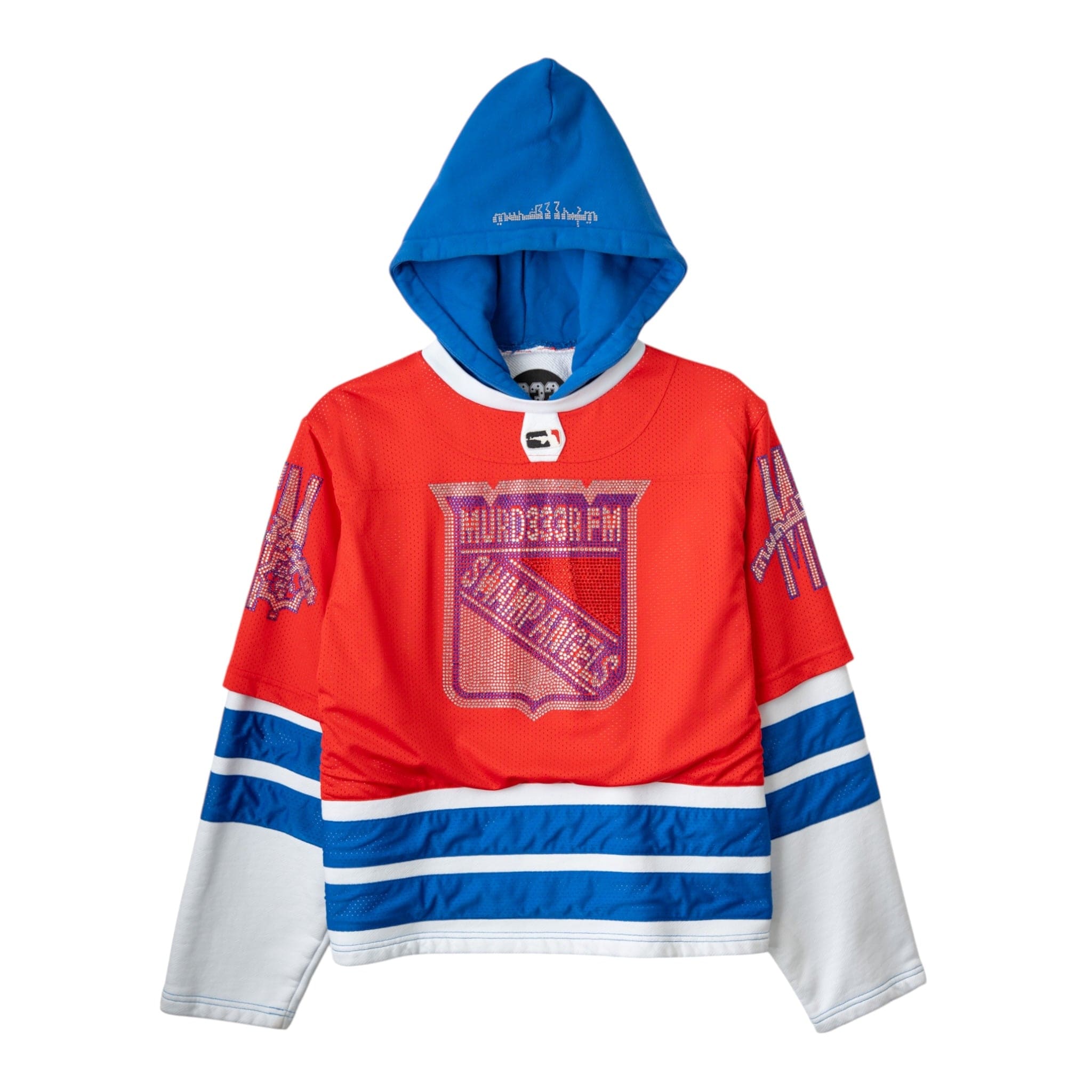 MURD333R FM Swamp Angels Rhinestone Logo Hooded Hockey Jersey Sweatshirt Blue Multi