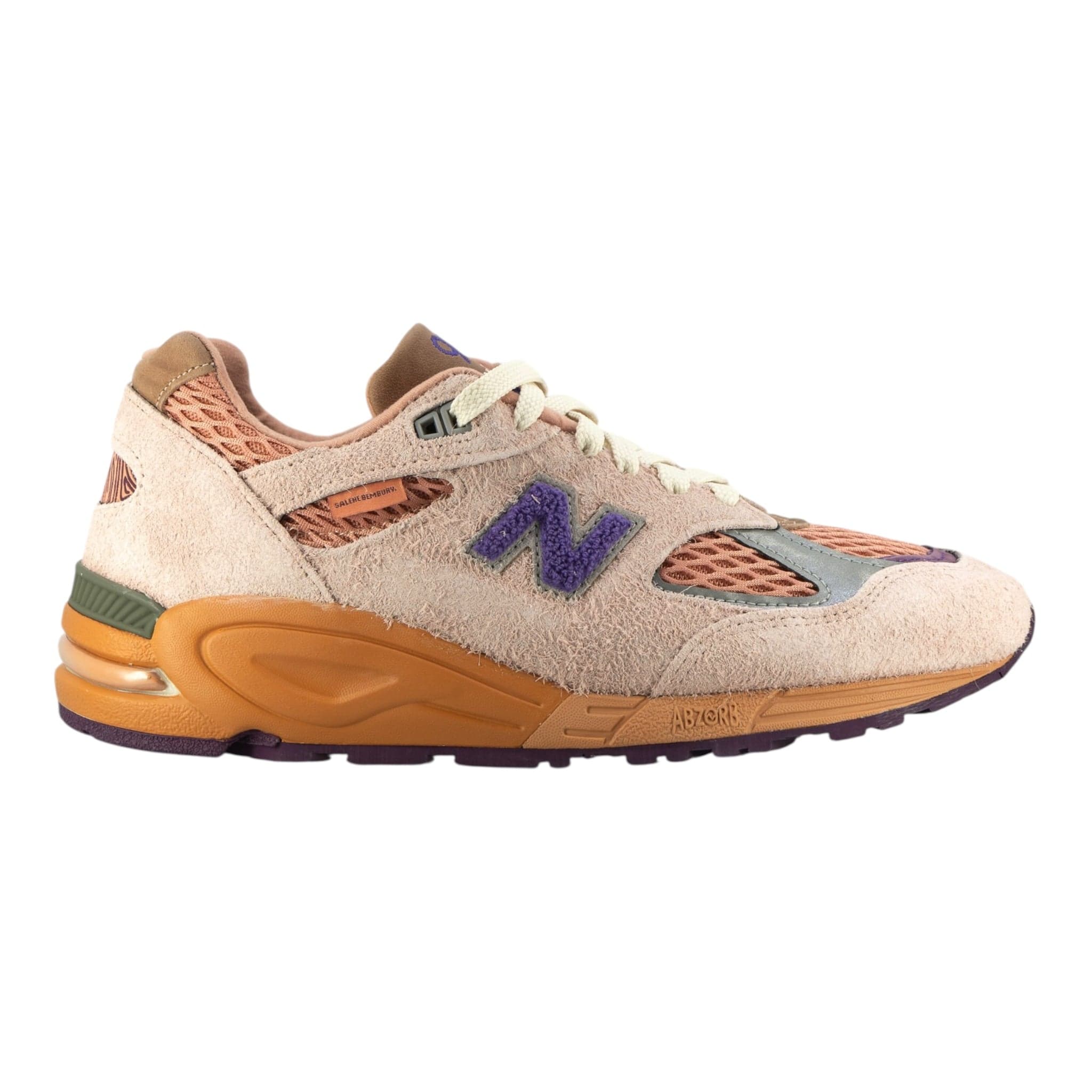 The upper of this 990v2 running shoe sports terra cotta spacer mesh underlays, misty rose hairy suede overlays, reflective silver hits on the toe box, and a purple passion chenille "N" on the side panel. The ABZORB midsole is terra cotta and the insole is cork with New Balance and Salehe Bembury branding. The rubber outsole is also purple passion.