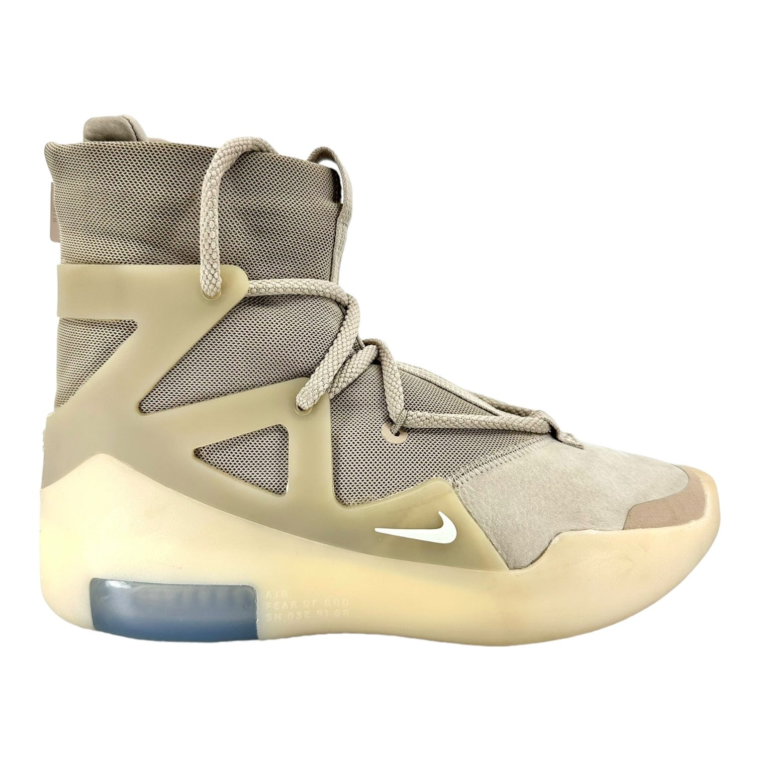 This FOG 1 is composed of an oatmeal breathable mesh upper, signature TPU heel and cage inspired by the Air Huarache Light, as well as its double-height Zoom Air heel unit that resembles the Air Max 180. A back zipper and cord laces complete the design. These sneakers released in November of 2019 and retailed for $350.