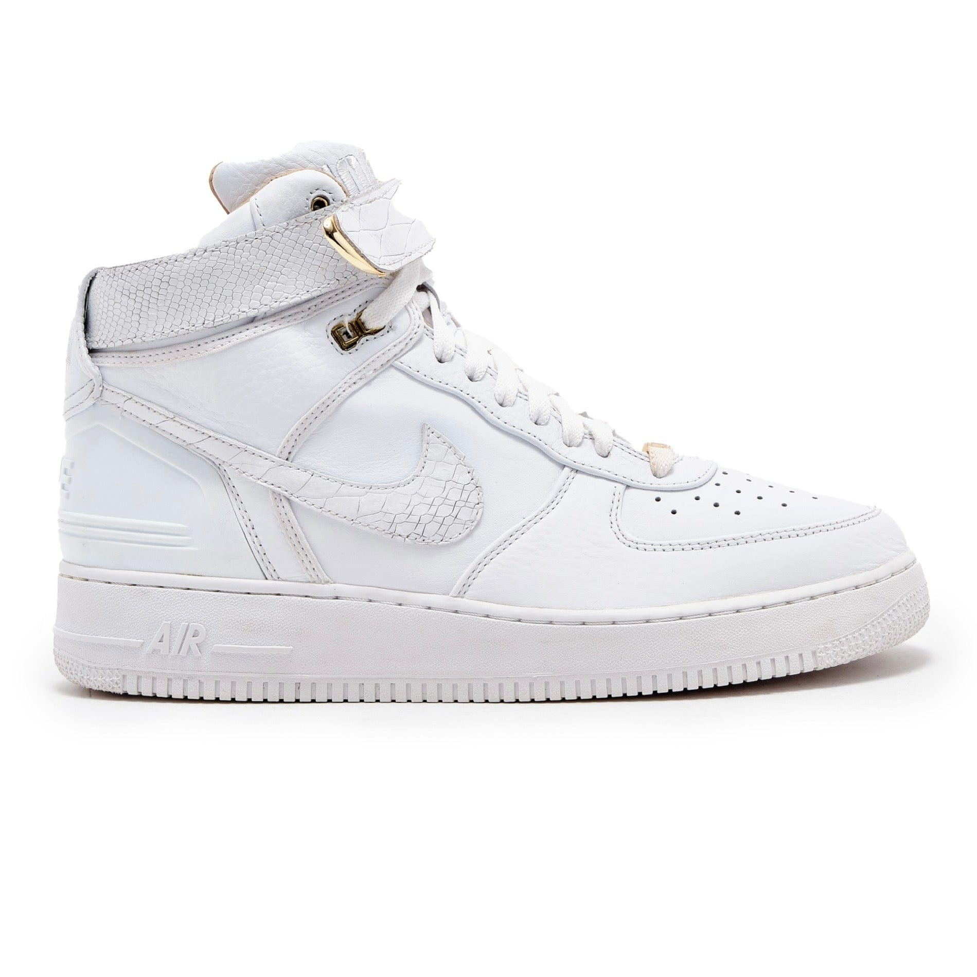 The Just Don Nike Air Force 1 High (AF100) upper is crafted from full-grain leather. Perforations on the toe box enhance breathability. Adding to its versatility, the sneaker includes a detachable ankle strap that allows for a personalized fit. The strap is adorned with gold hardware and features the distinctive "Just Don" emblem. Comfort and support are provided through a padded collar and cushioned midsole. The outsole, made of durable rubber, ensures traction and stability. Notable branding elements include the Nike Swoosh displayed on the sides and heel, as well as "NIKE" lettering on the heel.