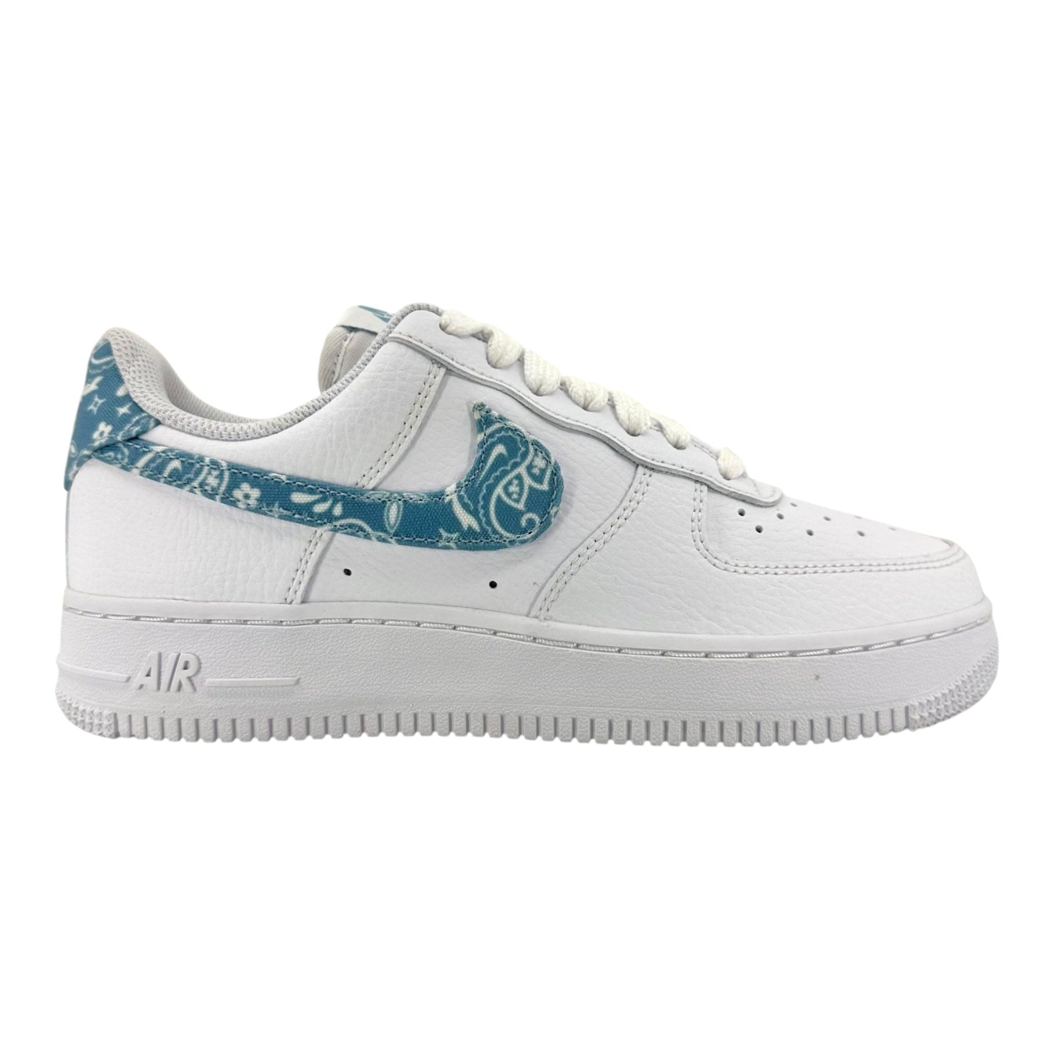 The Nike Air Force 1 Low 07 Essential White Worn Blue Paisley (W) upper is white-on-white tumbled leather from heel to toe, matching the laces, the mesh sock liner, the midsole, and the outsole. The white upper creates a backdrop for the profile’s Swooshes in worn blue twill, featuring the paisley bandana print. The worn blue paisley print is also on the heel panel with an embroidered Nike logo in white.