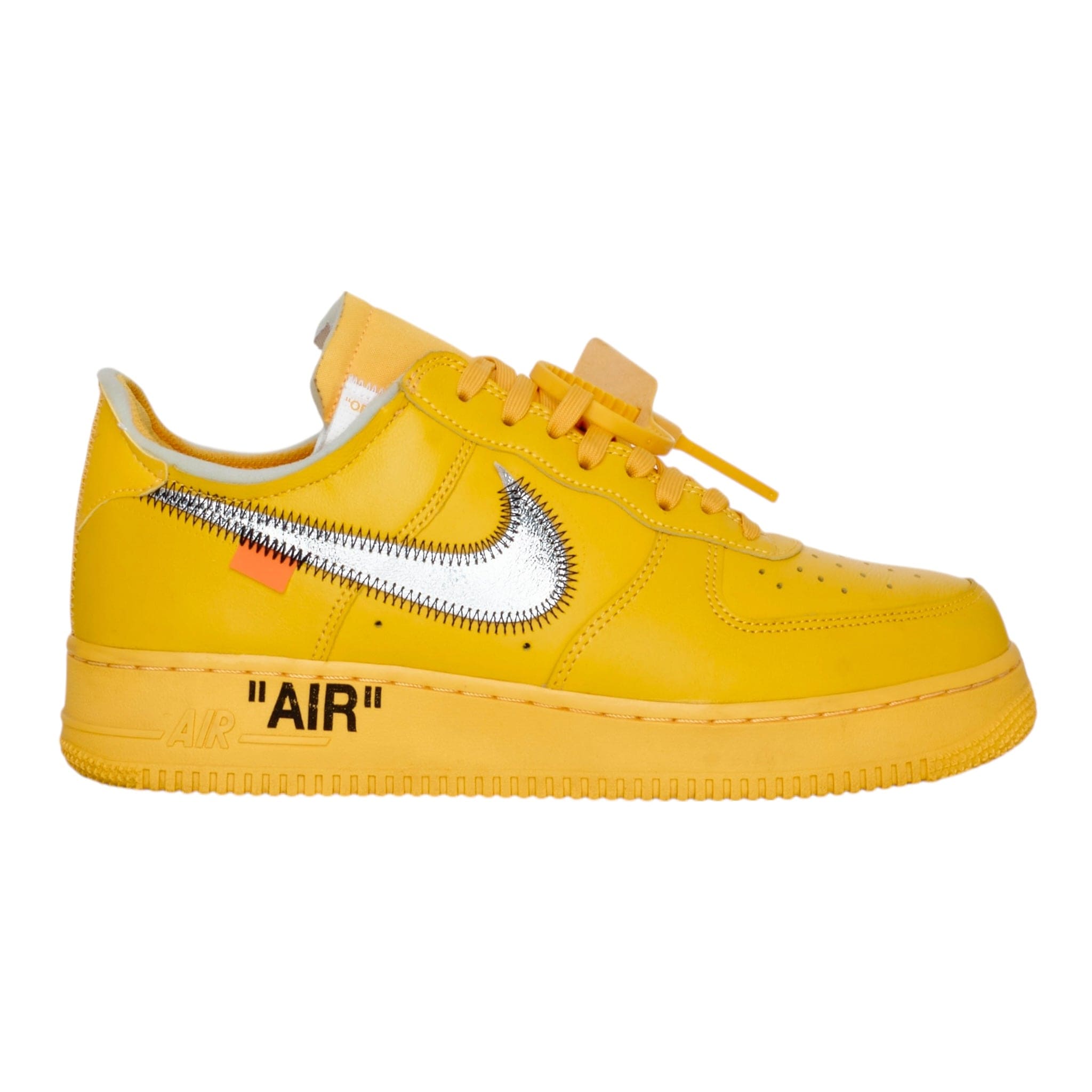 The Nike Air Force 1 OFF-WHITE University Gold Metallic Silver features a University Gold leather upper with Metallic Silver Swooshes and orange tab detailing. From there, foam construction is exposed at the ankle and tongue, continuing Abloh’s themes of deconstruction. Signature "AIR" text on the sole and a monochromatic zip-tie wrapped around the laces completes the design.