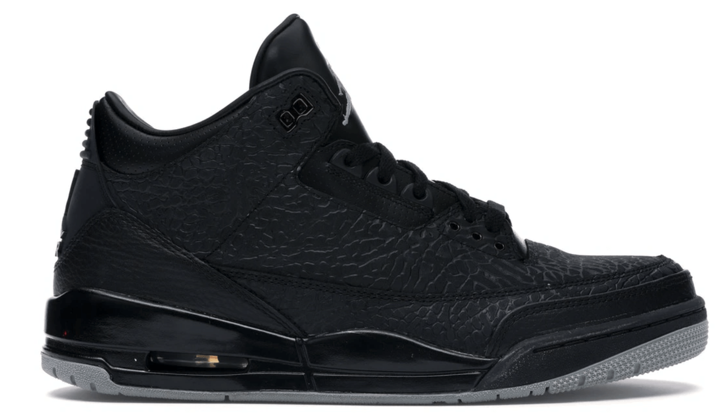 After the success of the 2007 AJ3 "Flip" release, Jordan Brand revisited the unique design with a black Jordan 3 Retro "Flip" colorway in 2011. Like the first Jordan 3 Flip, the iconic Elephant Print originally placed on the heel and toe surround by Tinker Hatfield is ditched in favor of tumbled leather. Instead, the upper panels including the toebox and sides are finished in a black Elephant Print. The all black upper also features smooth leather on the tongue and a soft leather grey inner lining give the AJ3 Flip a luxurious feel. The black midsole rests atop of a grey outsole while a metallic silver Jumpman logo rests on the tongue. The primarily black "Flip" colorway gave those who liked the "Black Cat" Jordan 3 from 2007, a new option with more premium materials on one of the most iconic sneakers to ever come from the Tinker Hatfield and Michael Jordan partnership. Like the first Jordan 3 Retro "Flip" colorway, the black version was met with polarizing responses. It seems, you either love it or hate it. But looking at the asking prices, it seems more people fall into the latter category when it comes to the black Jordan 3 Retro "Flip" colorway.