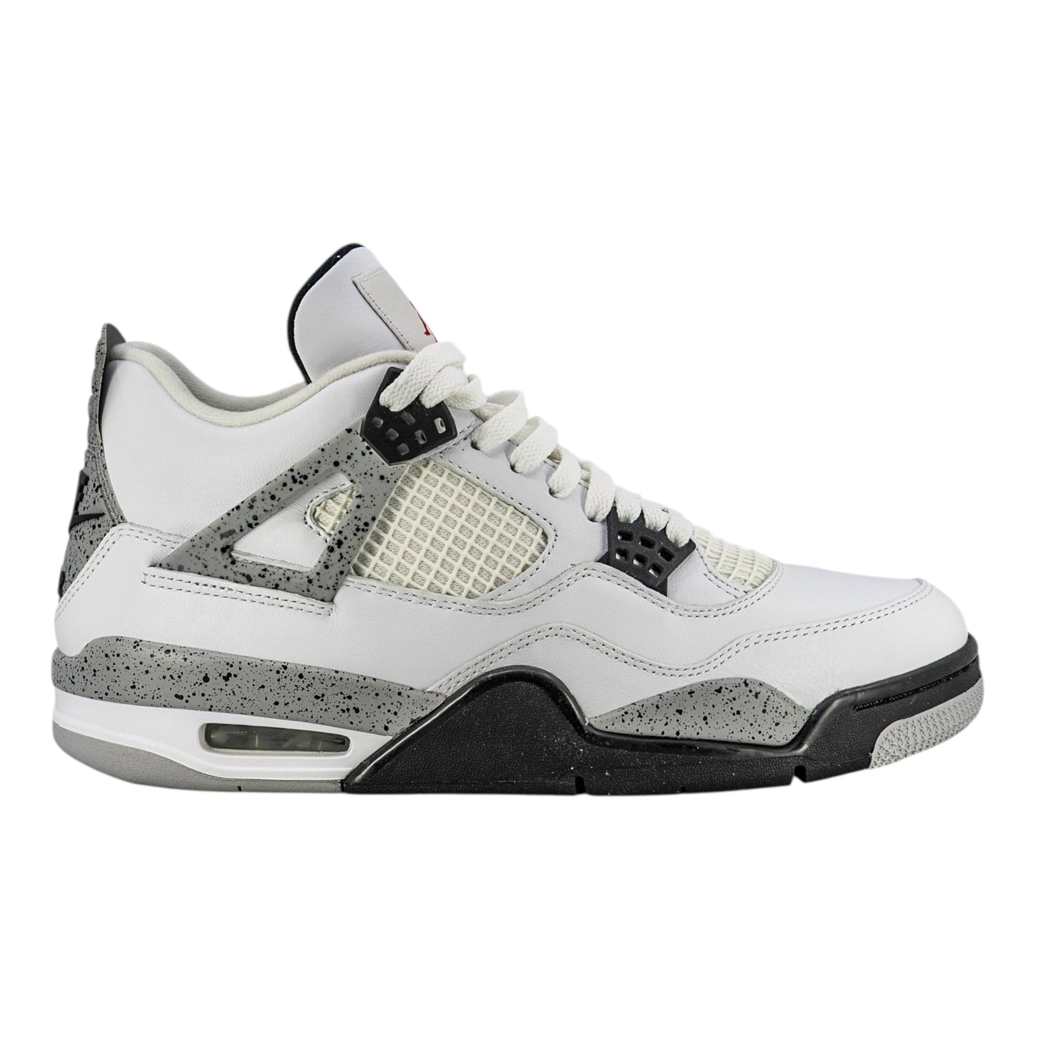 The Air Jordan 4 Retro White Cement 2016 features the classic 1989 colorway White/Fire Red/Black/Tech Gray. Black waffle eyestays and white mesh enhance the white leather upper. "Cement" refers to the black-speckled gray accents on the midsole, wings, and heel. A black Nike Air logo and Swoosh appear just below a cement-pattern heel tab. The white tongue features a red Jumpman above "Flight" printed in black. The black insole has a red Nike Air logo and Swoosh. The white midsole has visible Air. The rubber outsole includes every color in the colorway.