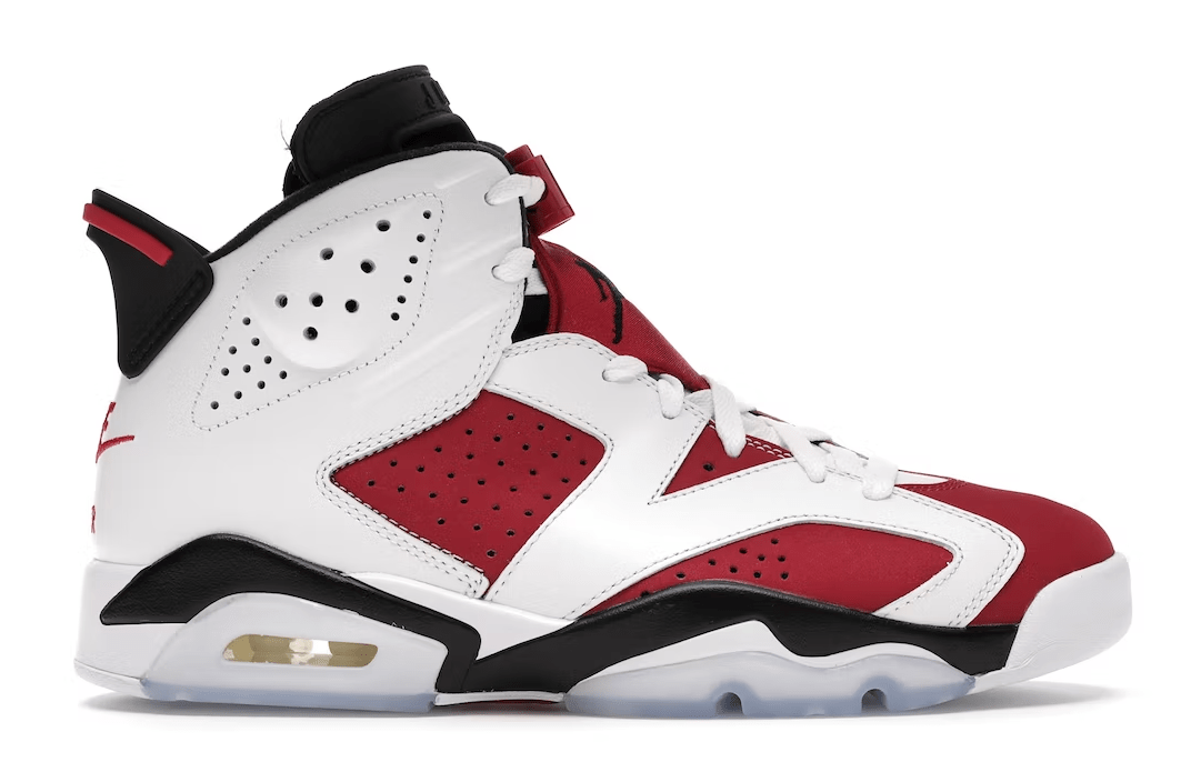 The Air Jordan 6 Carmine combines red, white, and black colors to represent the Chicago Bulls’ signature colors. The upper features bold red and white colors that help the model pop while on foot. From there, the upper is met with a white and black midsole, with hits of an icy blue outsole appear as well. The final touch to this OG’s return is the signature "Nike Air" on the heel, replacing 2008 and 2012 retros’ "Jumpman" logo.